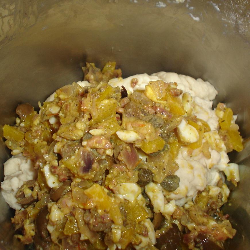 Unire all'impasto il condimento prepararato precedentemente: 1 min. vel. spiga