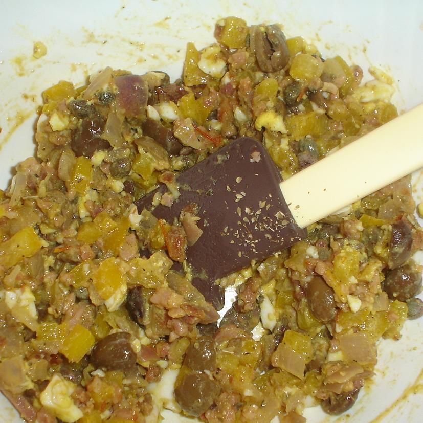 2. Mentre si prepara il soffritto nel boccale, tagliare le olive, sbriciolare l'uovo sodo e unire i capperi ed il pomodoro secco tagliato a pezzetti in una terrina.