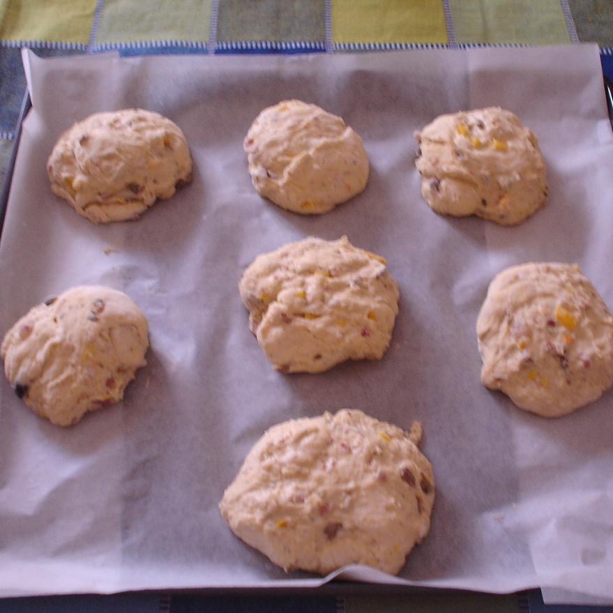 5. Dopo il tempo di riposo, sempre aiutandosi con un po' di farina, dividere la massa lievitata in 7-8 panini più o meno rotondeggianti, disporli su una teglia foderata di carta forno e lasciar riposare circa 30 minuti. Intanto riscaldare il forno a 220°.