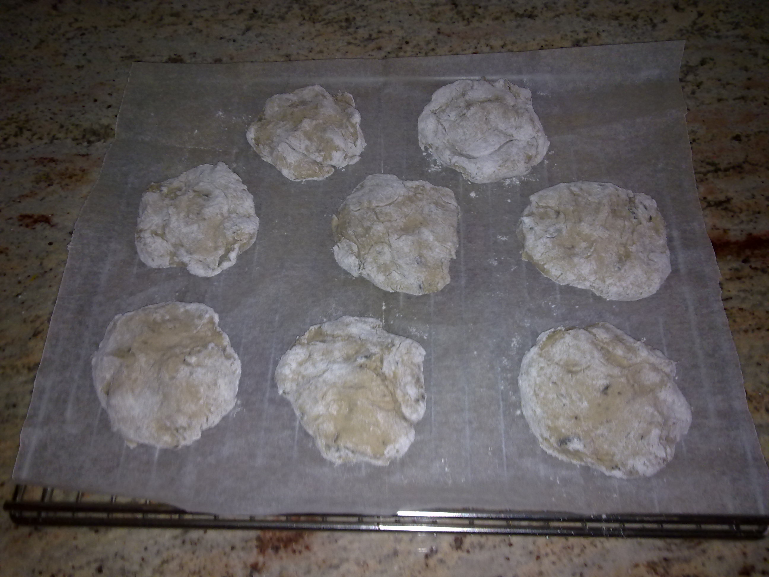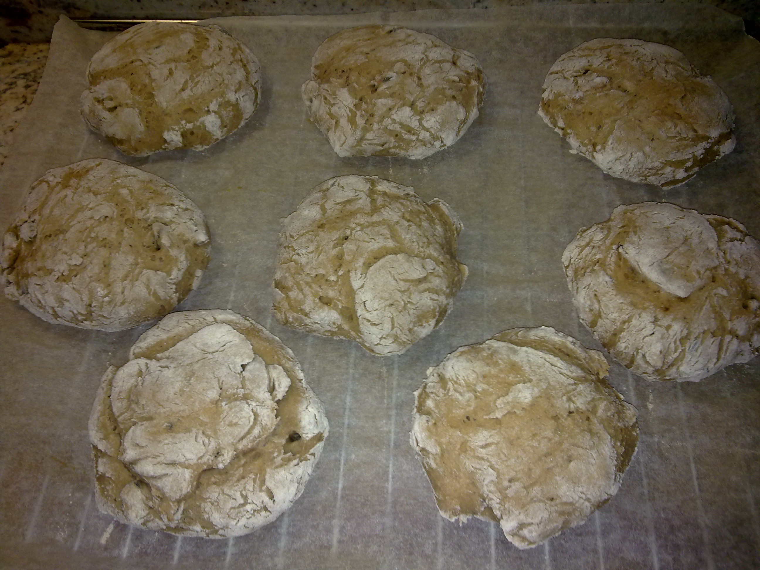 L'impasto risulta piuttosto appiccicoso,quindi con le mani infarinate prelevarne una quantità equivalente ad un'arancia, passarlo nella farina di segale ed appiattirlo un pò ma non troppo facendo in modo di lasciare soffice l'imposto ed adagiarlo sulla teglia coperta da carta forno. Procedere fino ad esaurimento dell'impasto.