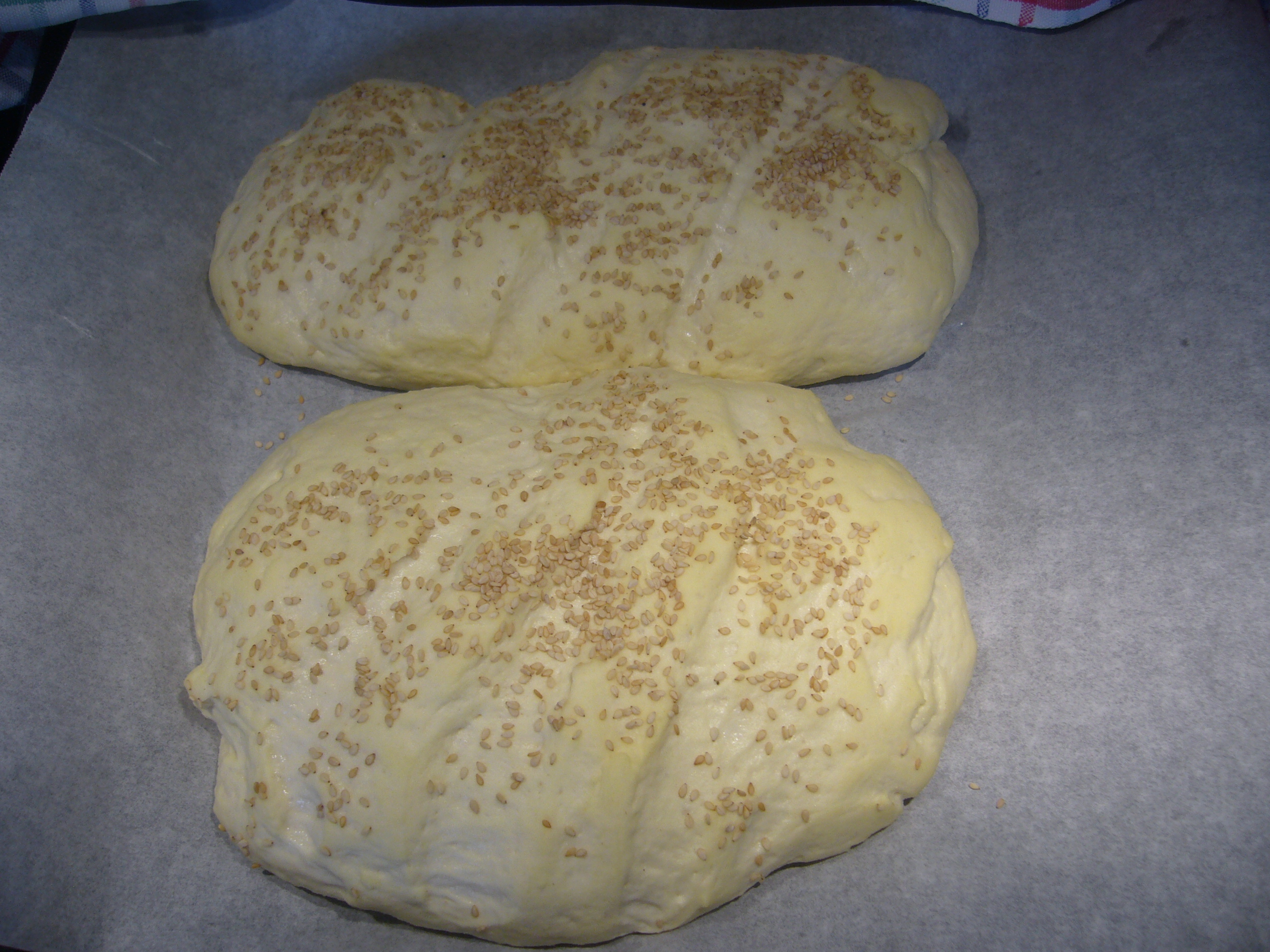 praticare sulle pagnotte dei tagli trasversali,spennellarle con acqua e distribuire sopra i semi di sesamo