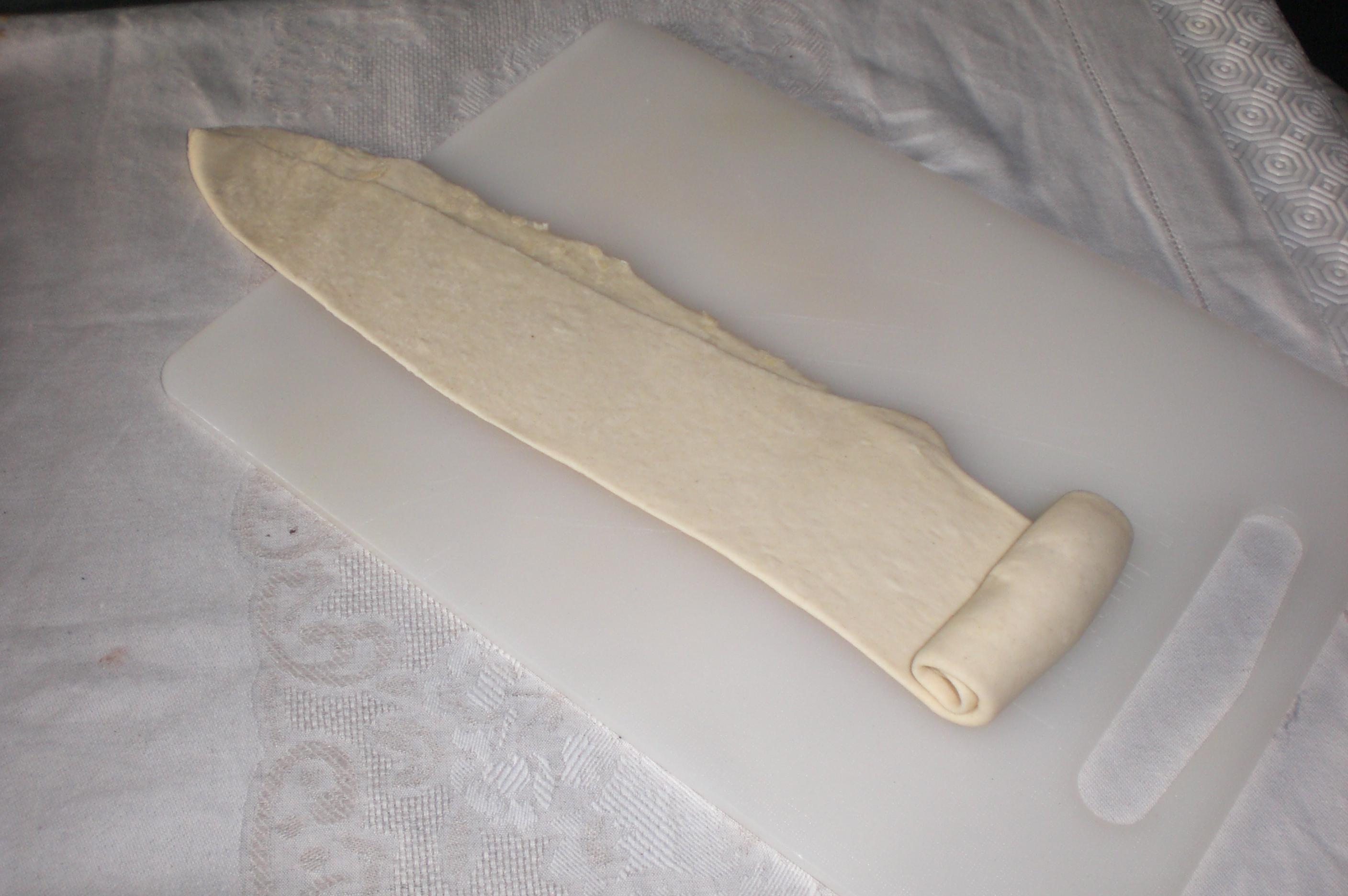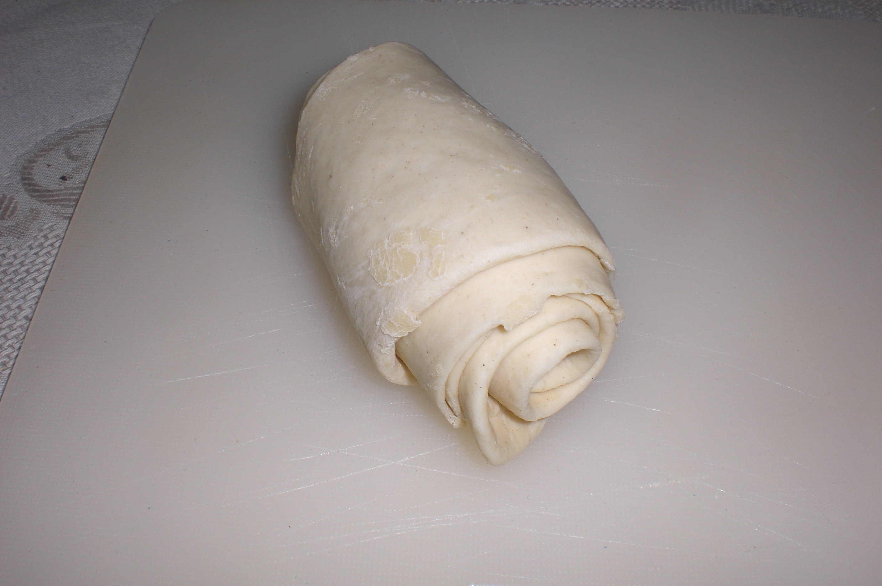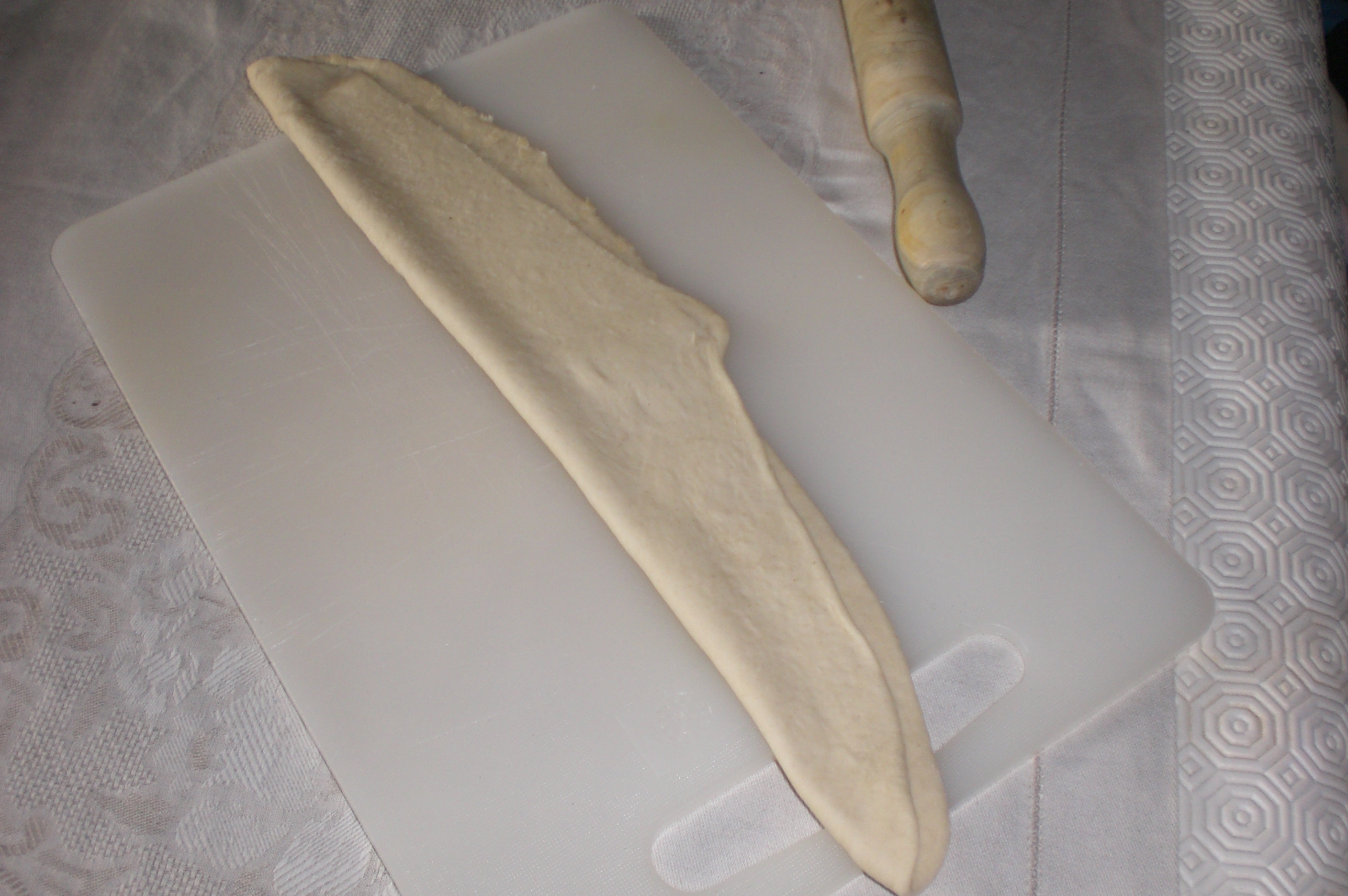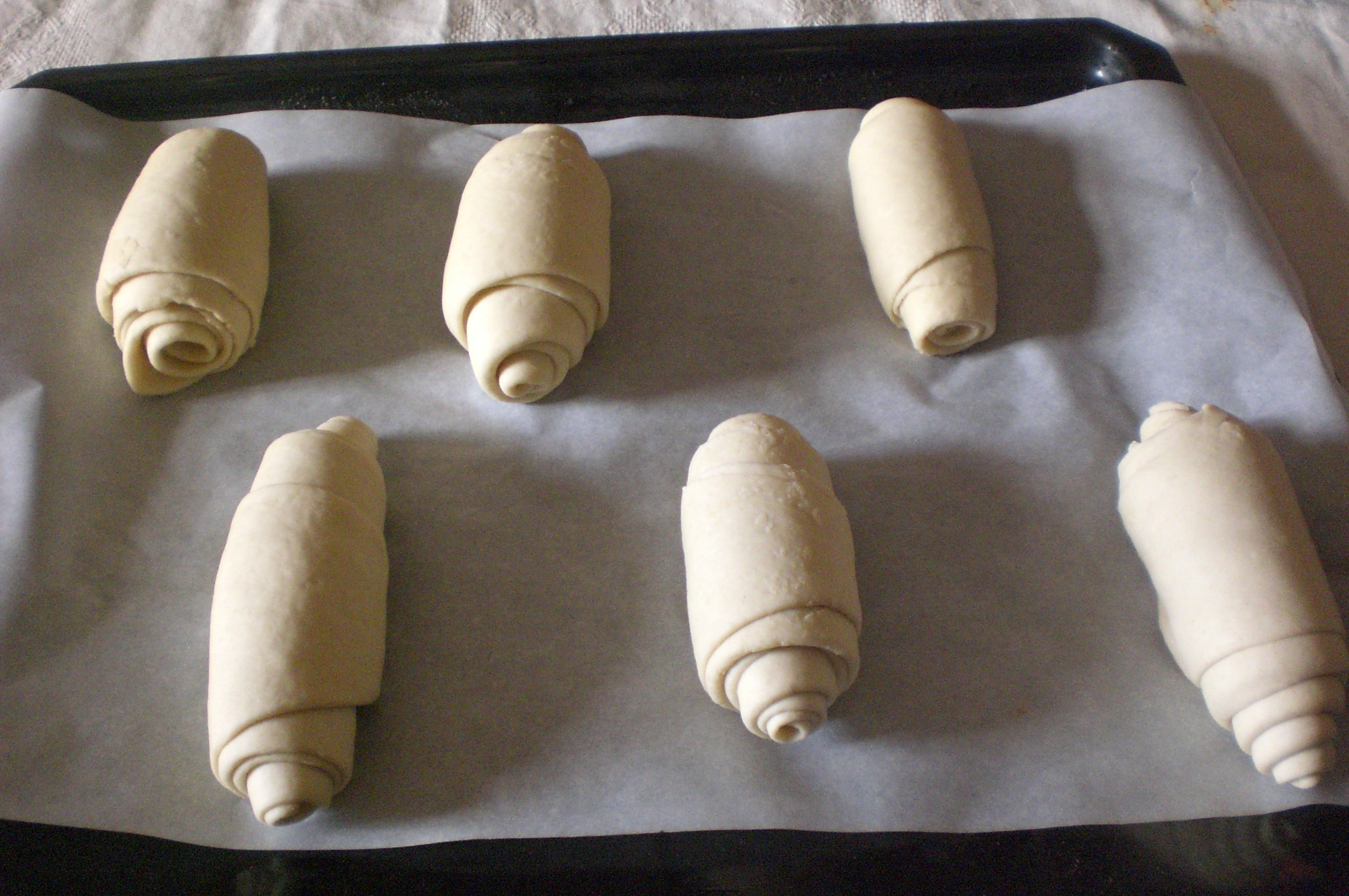 arrotolare e dopo aver fatto un taglio nel verso della lunghezza disporre tutti i panini sulla placca del forno coperta da carta forno; lasciare a lievitare per un'altra ora e mezza nel forno (io lascio sempre la temperatura più o meno 30 gradi)