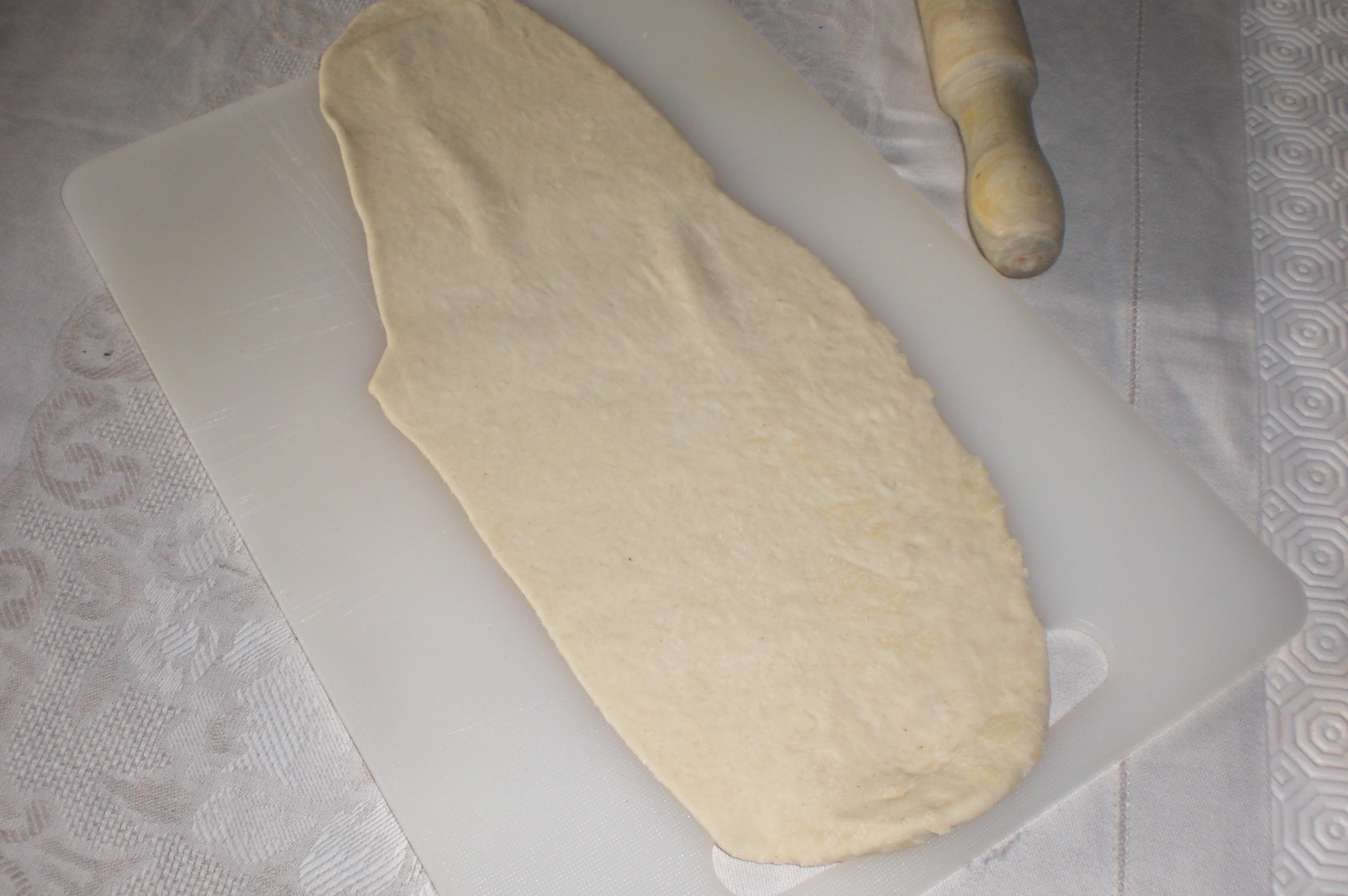 trascorso il tempo, riprendere l'impasto e dividerlo in 8 palline: stendiamo ogni singola pallina con il mattarello creando delle striscie molto lunghe e non più larghe di 3 o 4 dita
