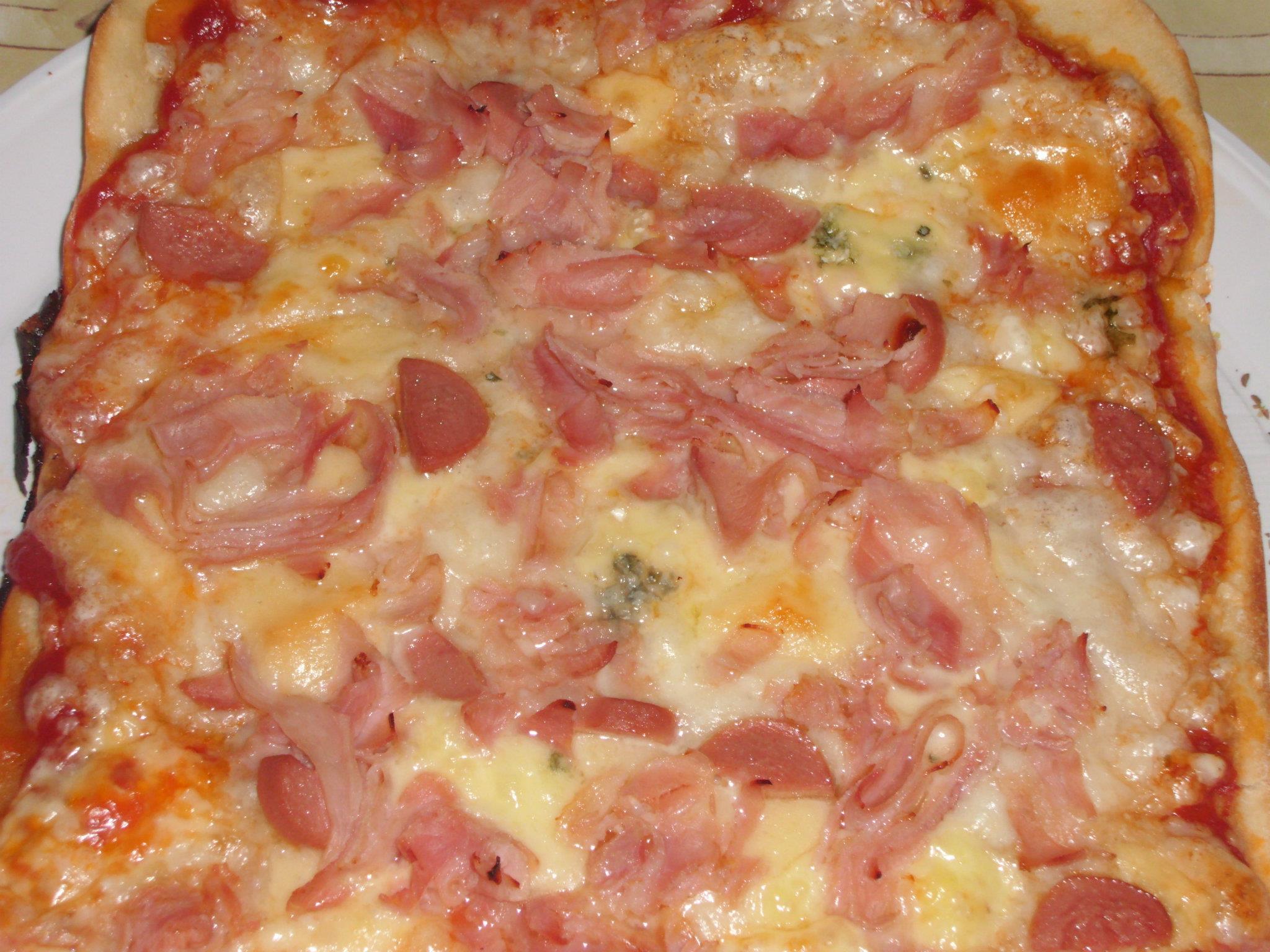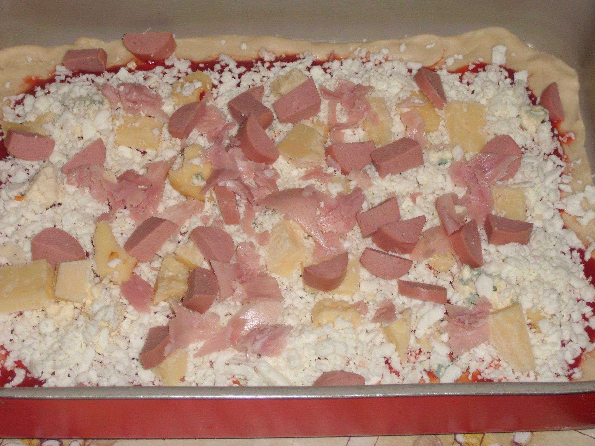 - Stendere la pizza e mettere il condimento di Gorgonzola, cotto e wurstel