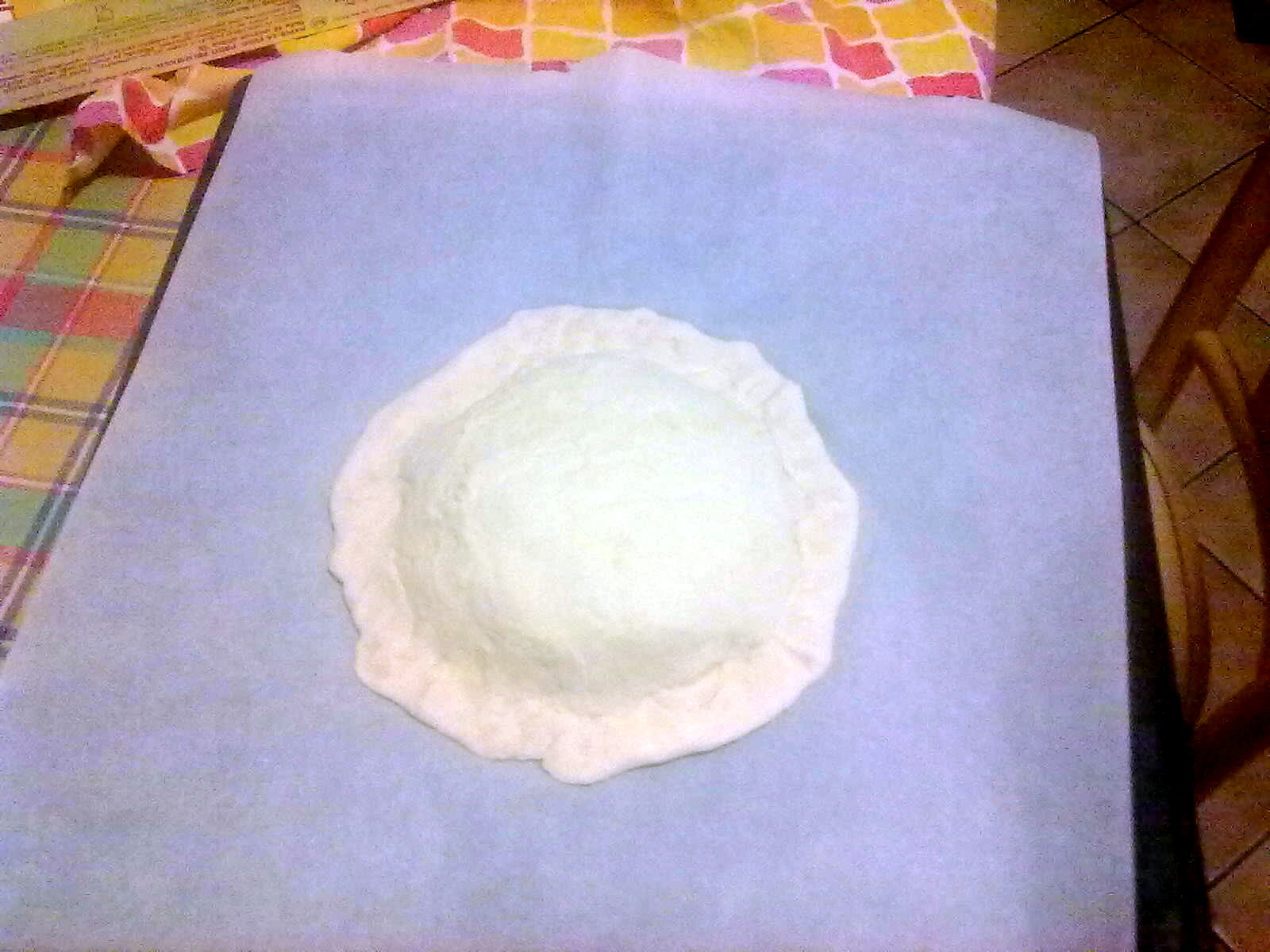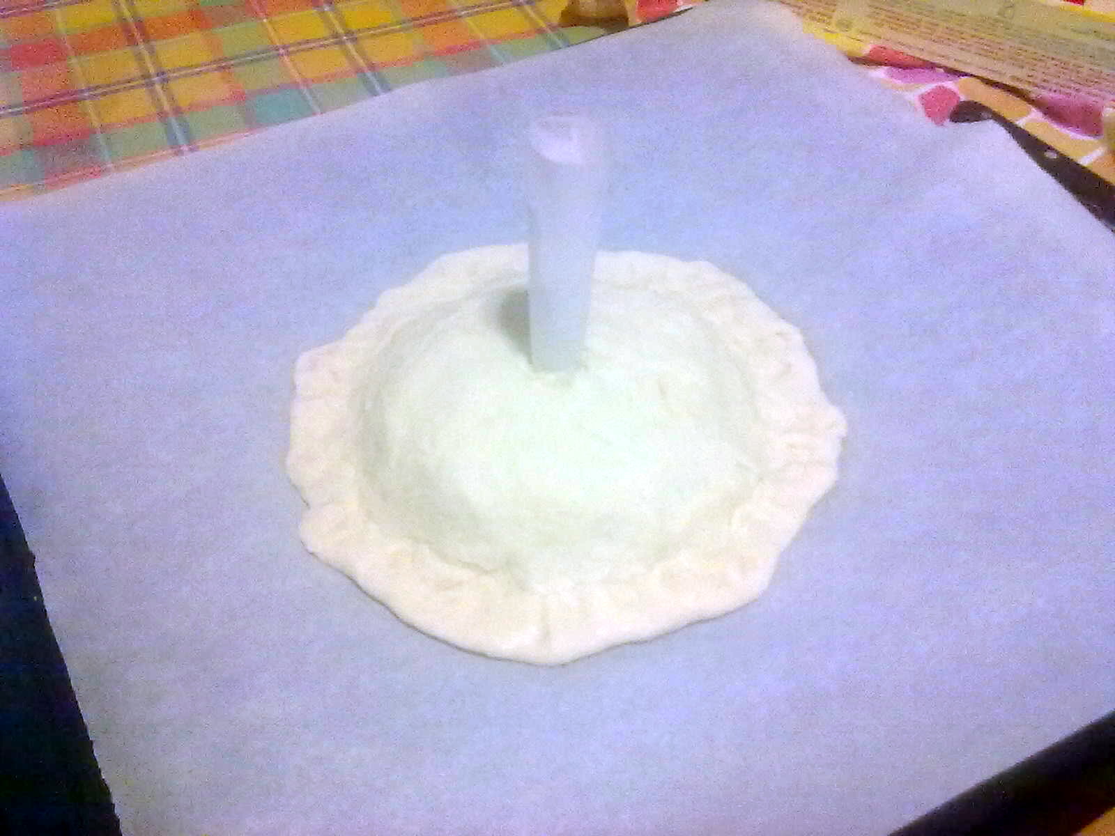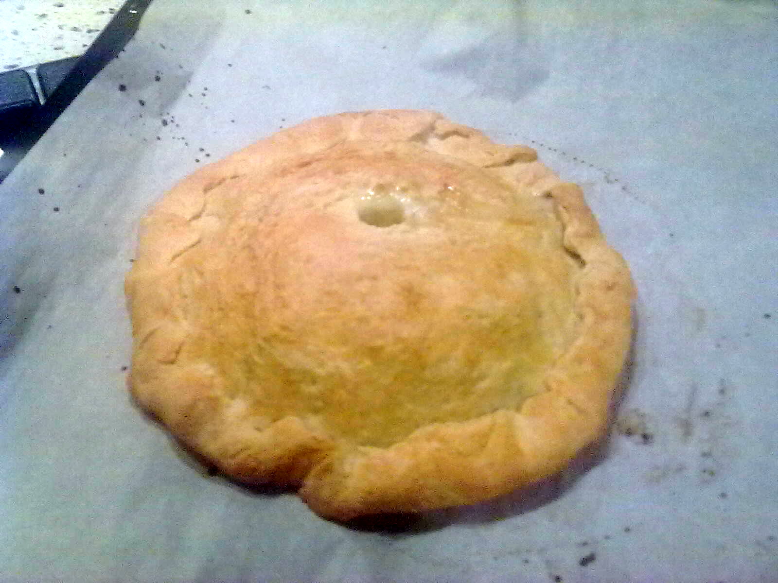Mettere il ripieno al centro lasciando liberi i bordi. Coprire con il secondo disco di pasta. Fare un foro al centro inserendo un piccolo imbuto di carta forno per la fuoriuscita del vapore.