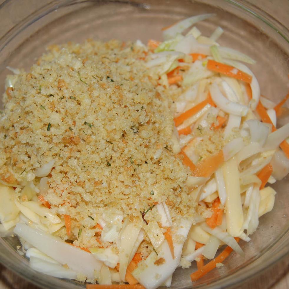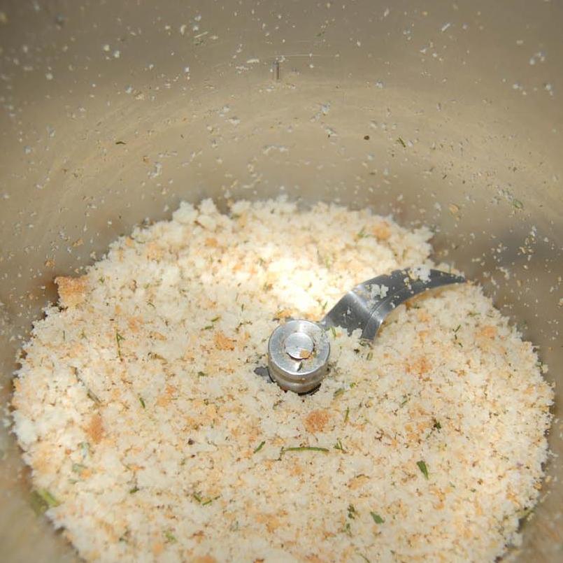 - Unire alle verdure precedentemente tritate i 2/3 del trito di pane e erbe aromatiche, salare e mescolare.
