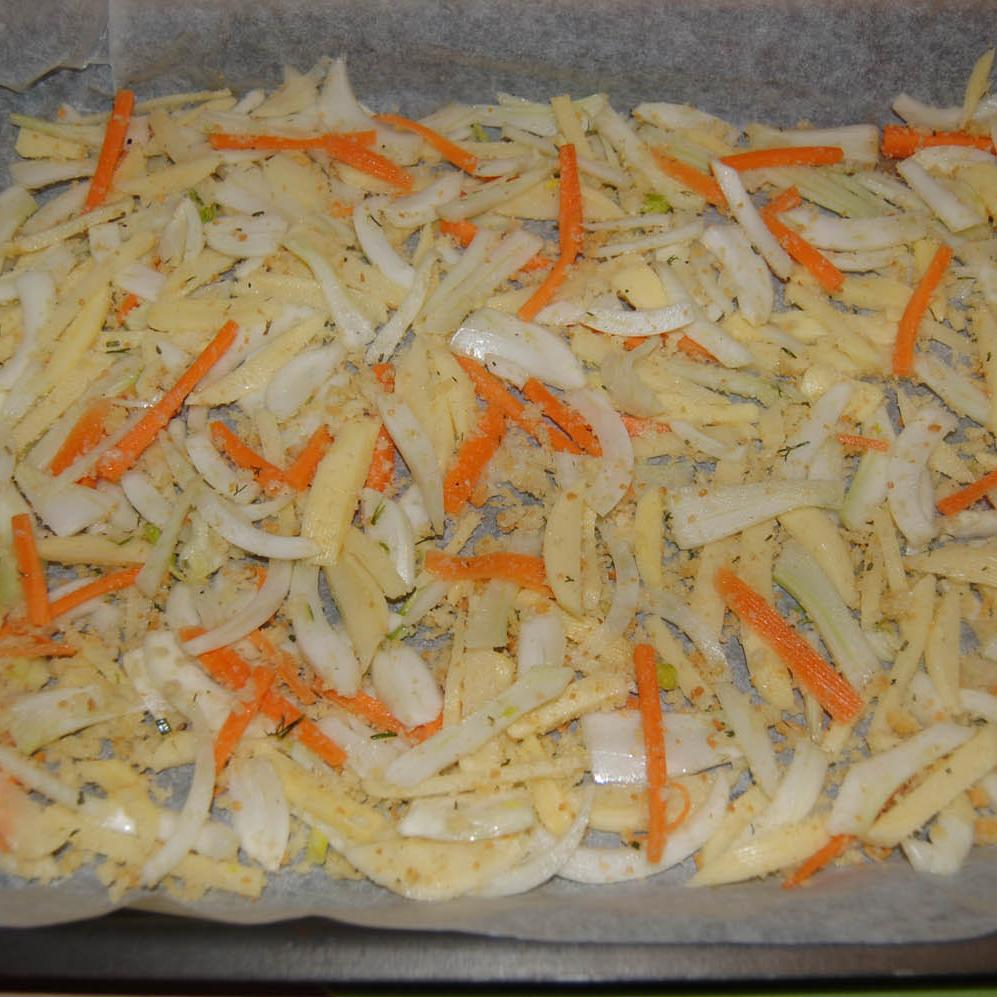 - In una teglia foderata di carta forno, versare metà delle verdure e livellare bene.