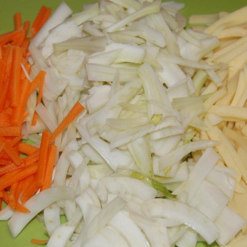 Unire sale, pepe, olio extra vergine e olio di semi e mescolare 5 sec. vel 7. - Tagliare finocchio, carote e patate a fiammiferi molto sottili.