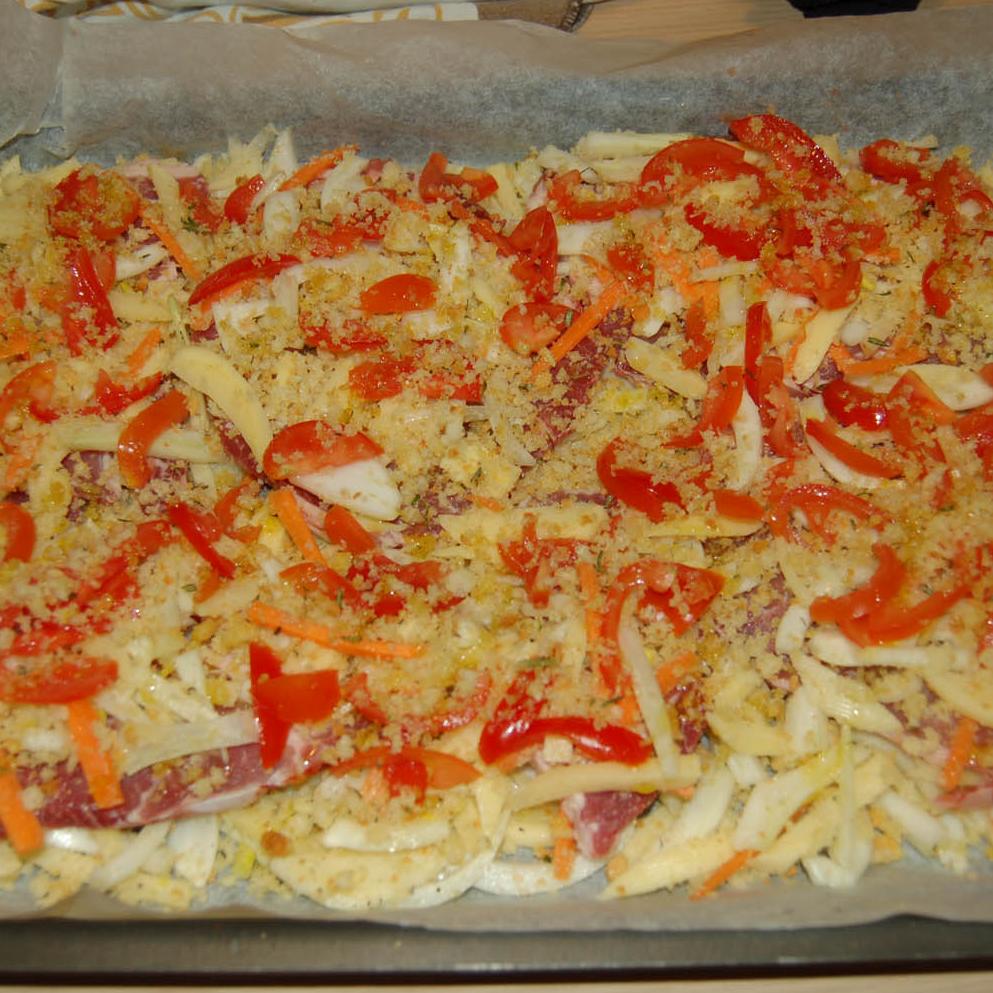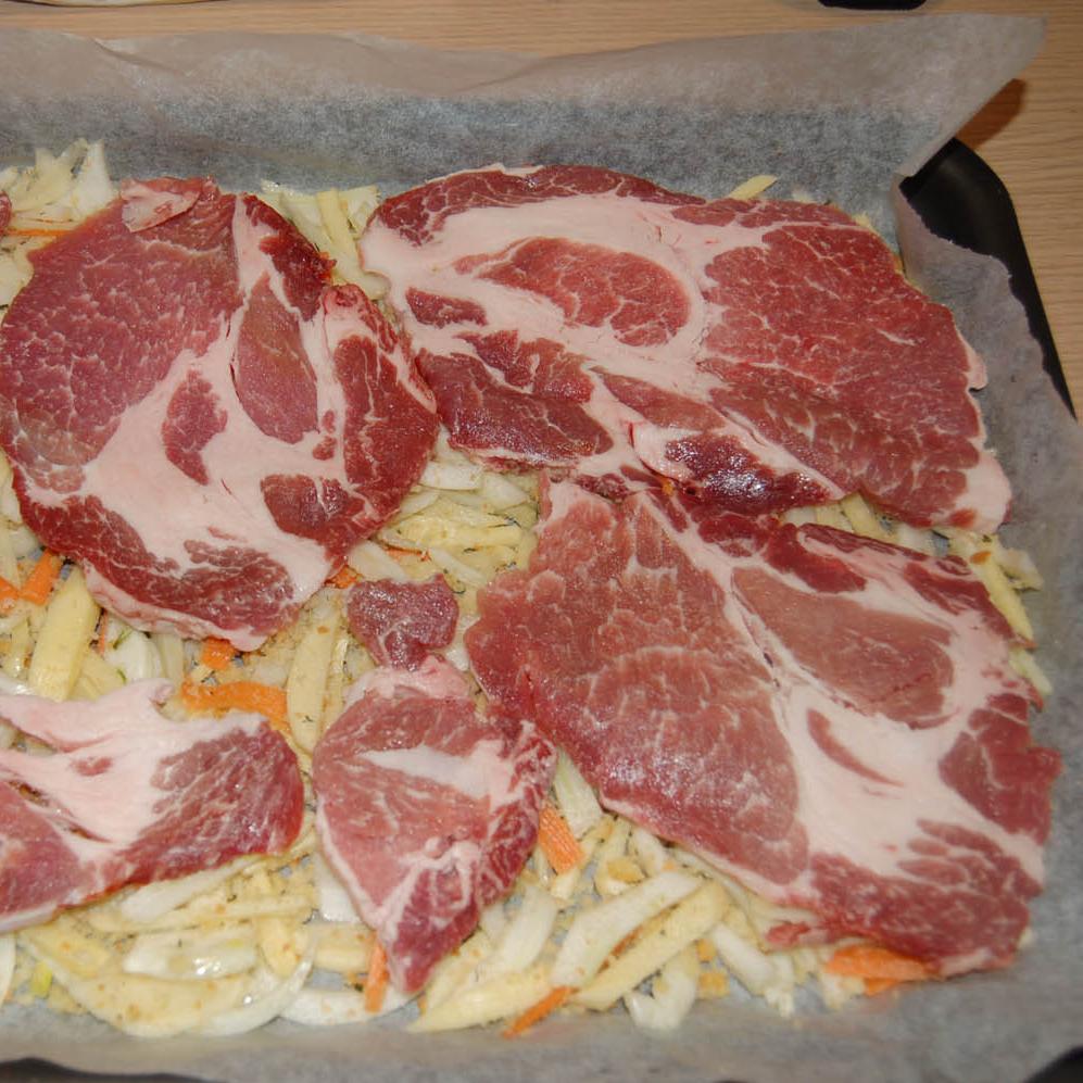 - Salare la carne e appoggiarla sopra le verdure, aggiungendo un pizzico di pepe e un po' di olio extra vergine.