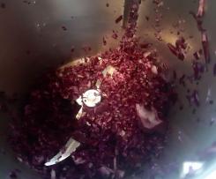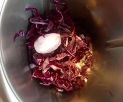 2. Ora senza lavare il coperchio chiuso"coperchio chiuso" mettete cavolo cappuccio gia lavato e tagliato assieme allo scalogno tritare per 10 Sec Vel 8 radunare con spatola