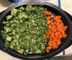 Dopo i 10 minuti di cottura riprendi il contenitore del Varoma e sistema nel vassoio da un lato le carote a cubetti e dall’altro le infiorescenze che avevi messo da parte.