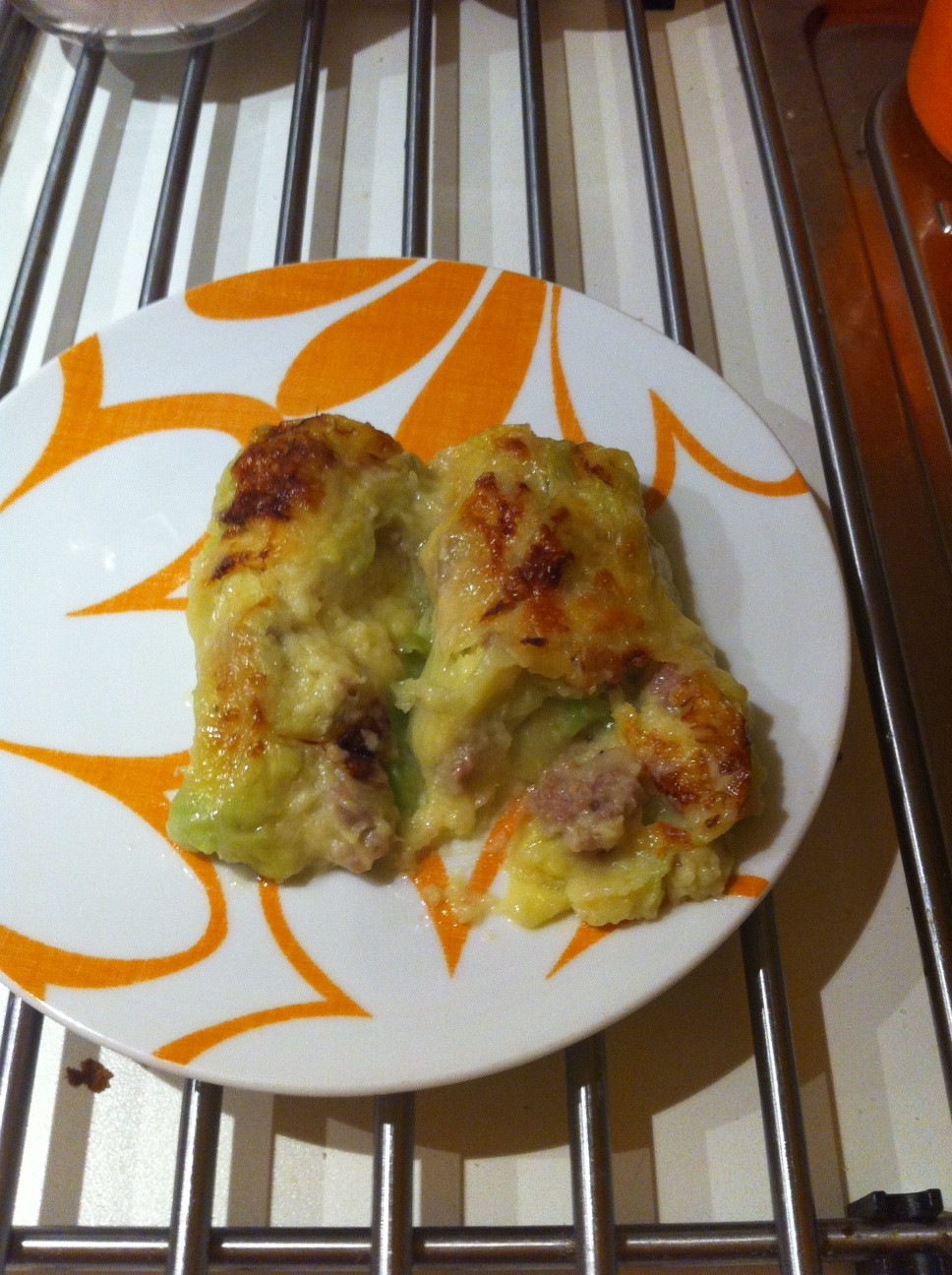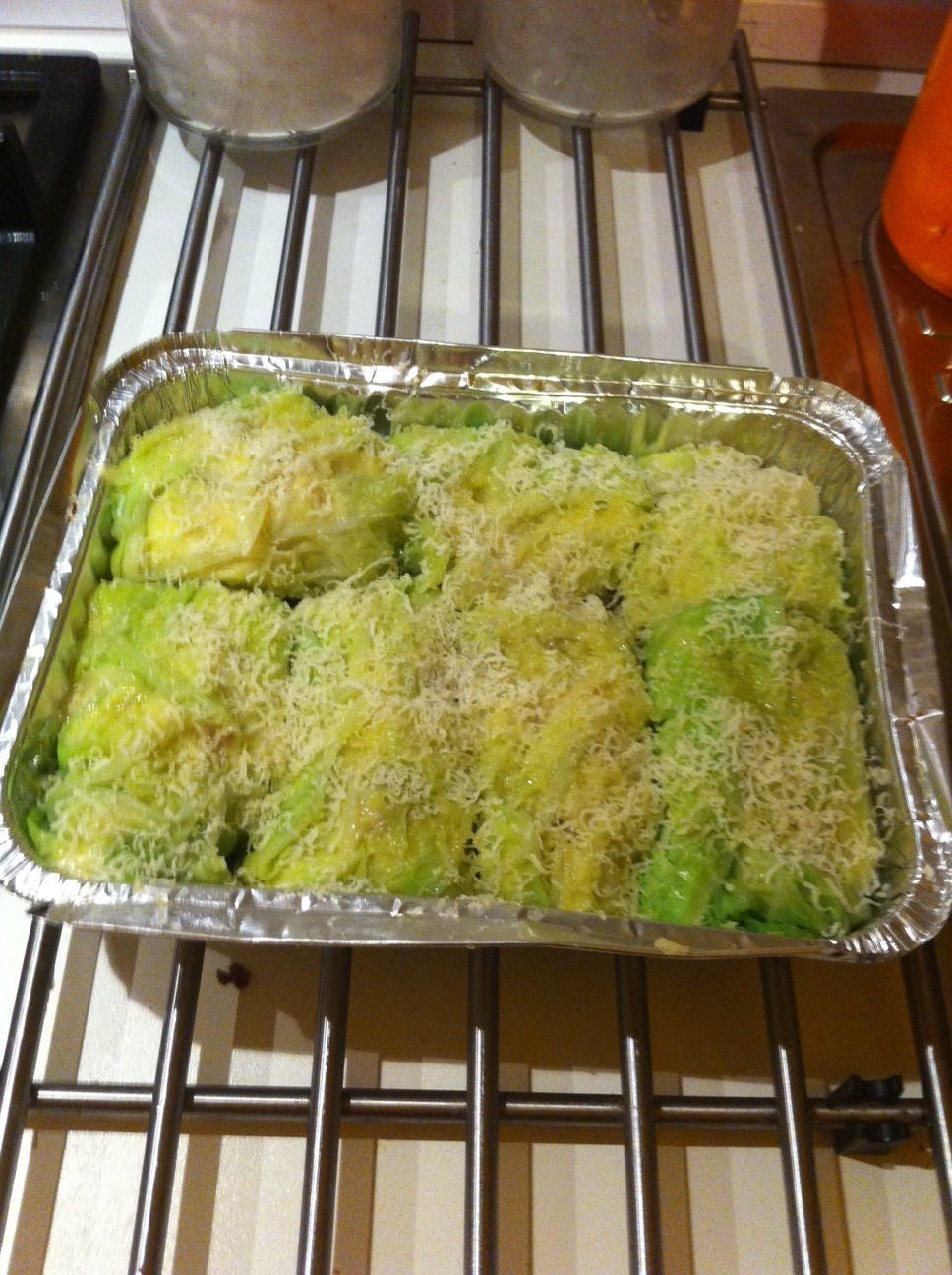 Al centro di ogni foglia di verza, - sovrapponendo un po' le foglie divise (dove avete tolto il bianco)-mettere delle cucchiaiate di ripieno e poi ripiegate a bauletto, mettete gli involtini in una pirofila unta e alla fine cospargere il tutto con un filo d'olio e parmiggiano.