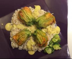 7. Disporre nel piatto il riso e i fiori ripieni e le fettine di zucchina e condire con la salsa al curry.
