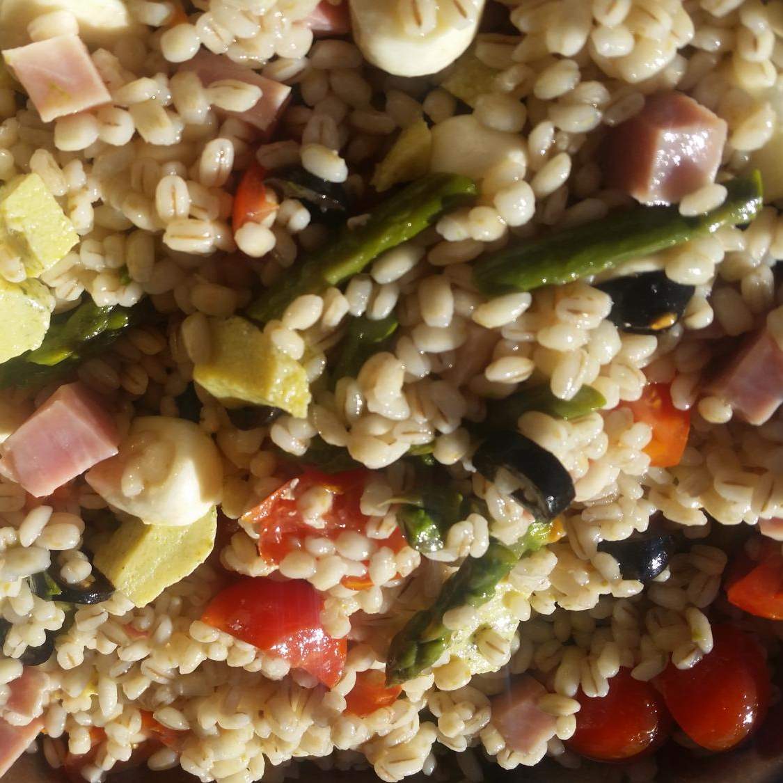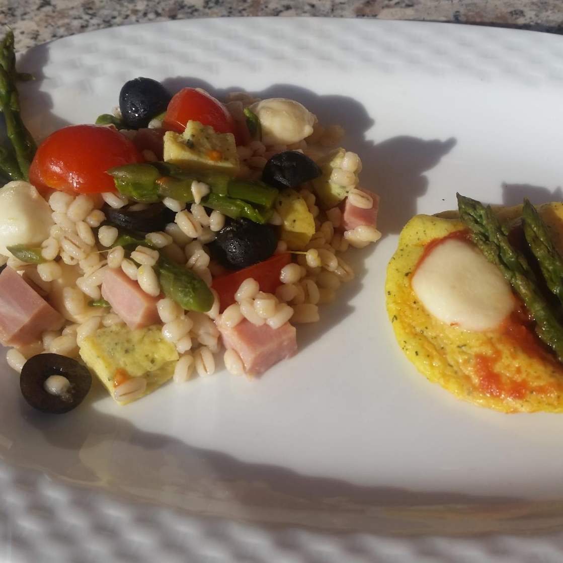 Traferite l' orzo nella ciotola dove avremo preparto pomodorini tagliati olive tagliate e mozzarelline prosciutto cotto a dadini e ritagli di frittata e asparagi a pezzi condite il tutto con olio oliva e sale q. b. e mettere in frigo per un paio di ore prima di servilo