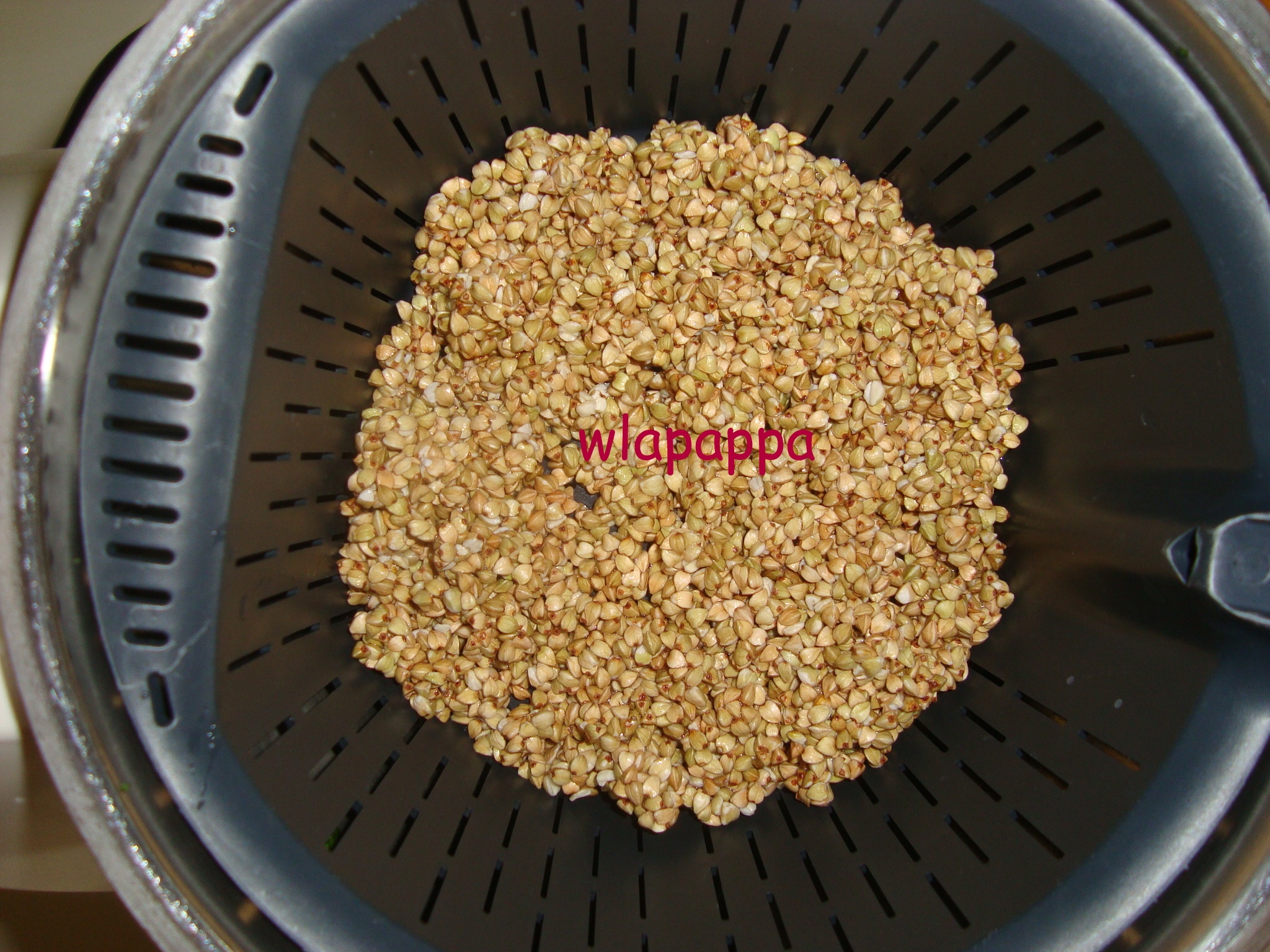 "coperchio chiuso" aggiungere l'acqua, posizionare il Varoma, 10 minuti temp. varoma, vel. 2Nel frattempo mettere il grano saraceno nel cestello e sciacquarlo sotto il getto d'acqua del rubinetto, poi (al termine dei 10 minuti) inserirlo nel