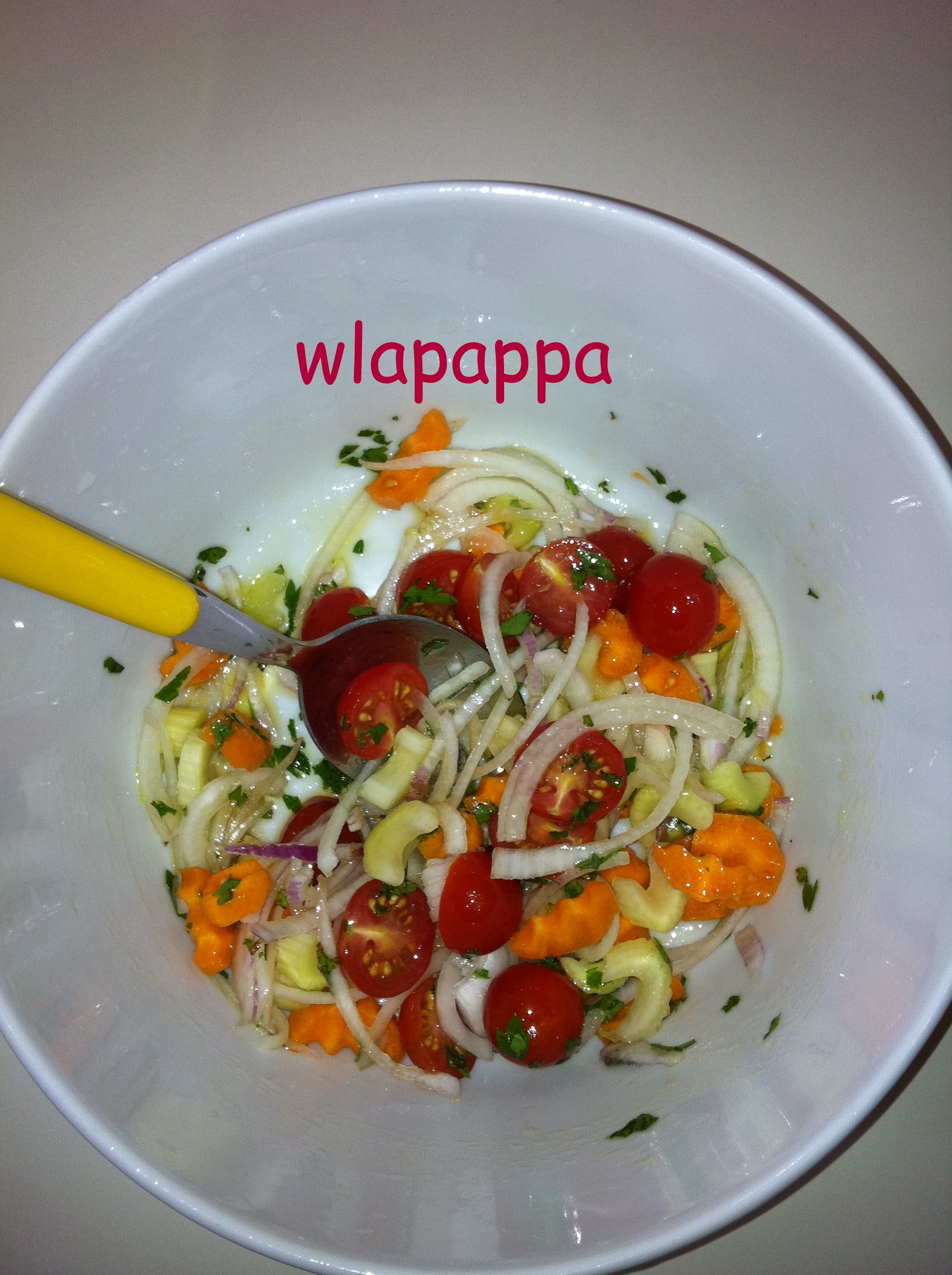 Scolare il cipollotto e nella stessa bacinella aggiungere i pomodorini, le insalate, la carota e condire con olio, sale, un po' di trito di menta e qualche goccia di aceto balsamico (pochissime, io 3 di numero).
