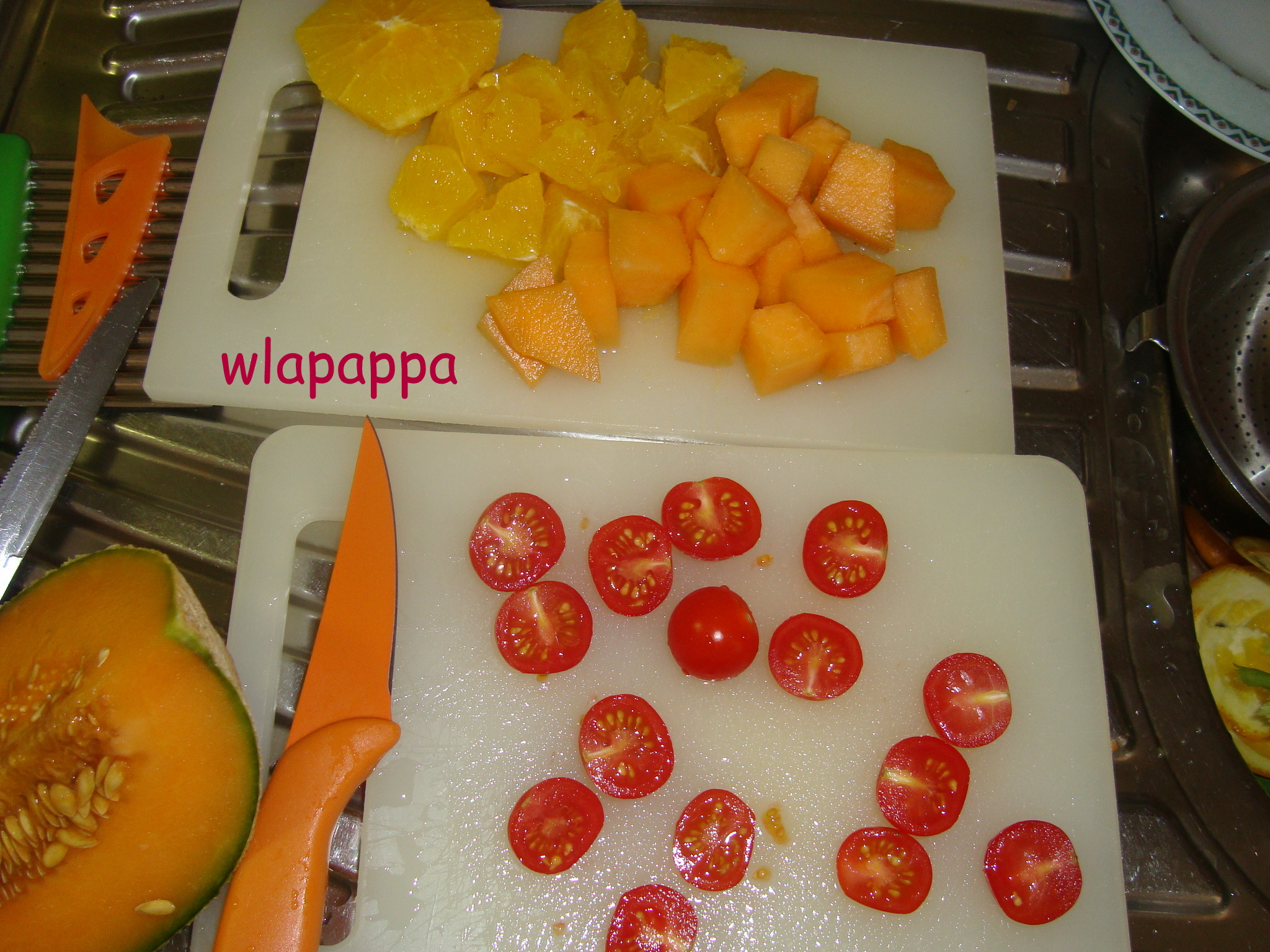 Tagliare il melone a cubetti, i pomodorini a metà, la carota ed il sedano a rondelle e l'arancia a dadini.