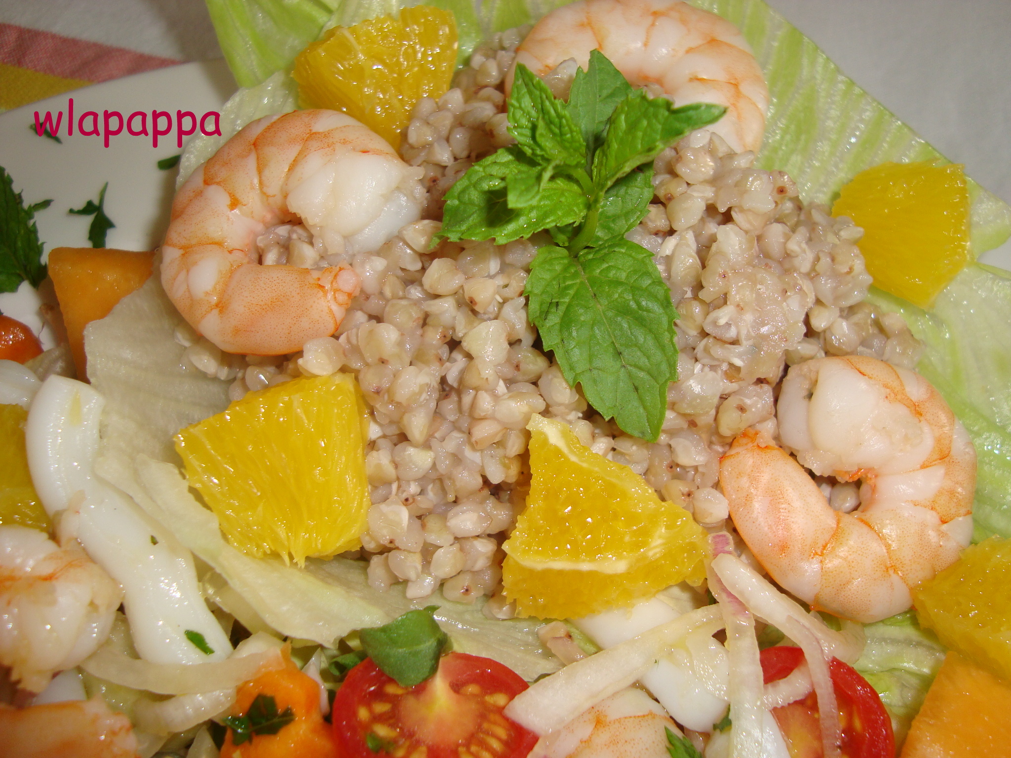 In un lato del piatto mettiamo una foglia grande di lattuga iceberg e adagiamoci il grano saraceno, condiamo con un velo d'olio ed un pizzico di sale. Aggiungiamo qualche coda di mazzancolle, arancia e trito di menta.