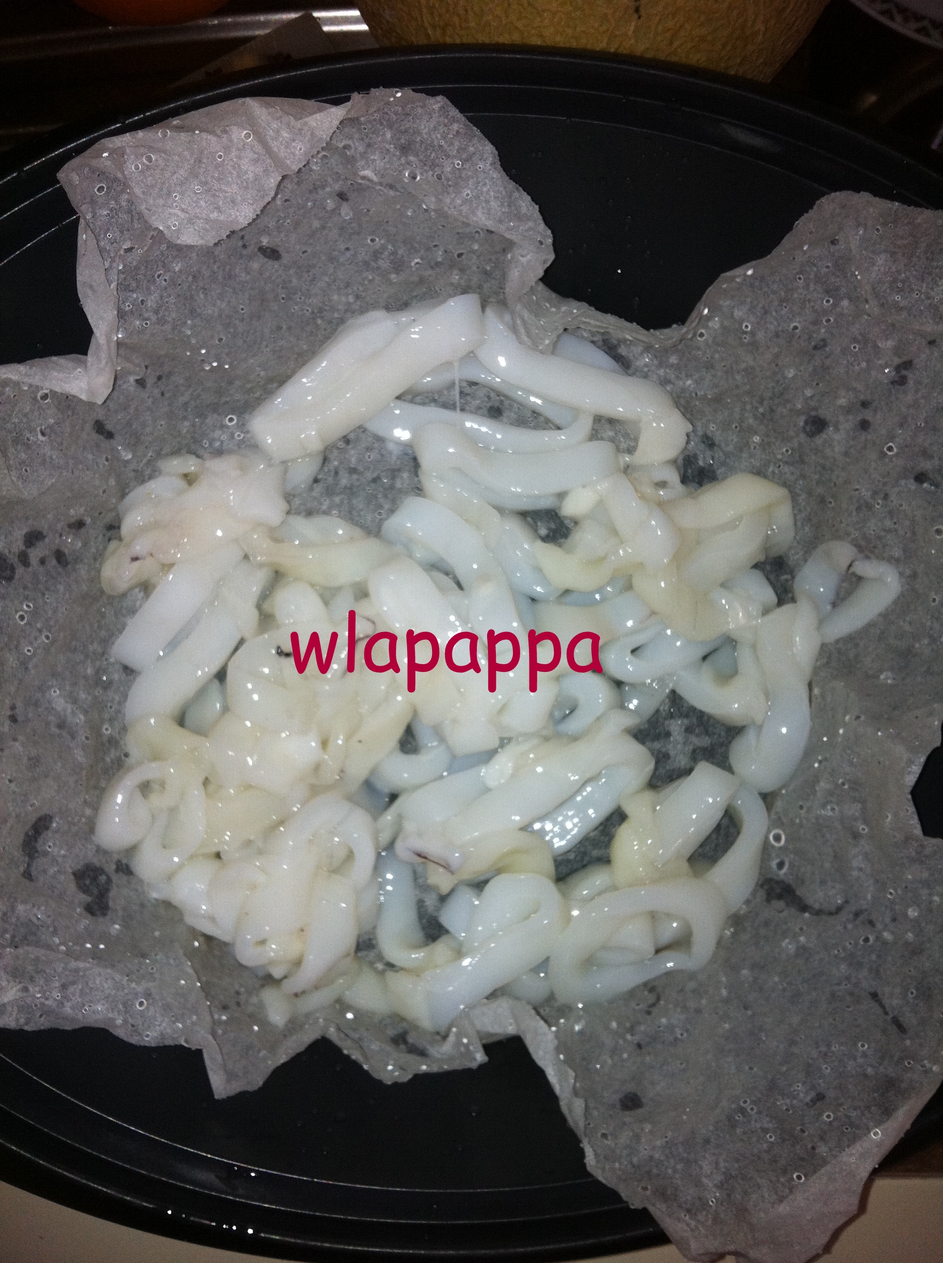 Tagliare a metà gli anelli di calamaro e sistemarli nel Varoma ricoperto di carta forno bagnata e strizzata.