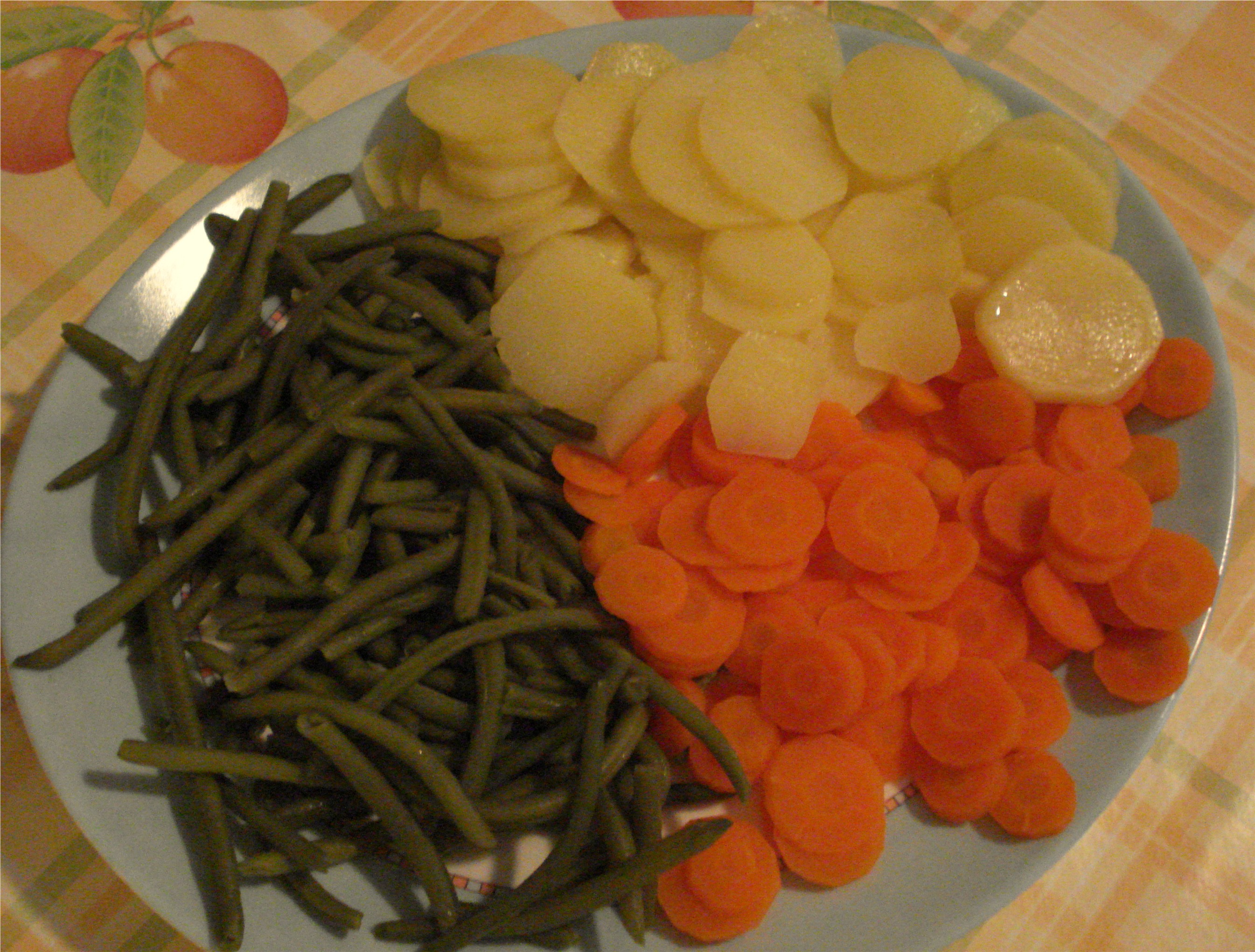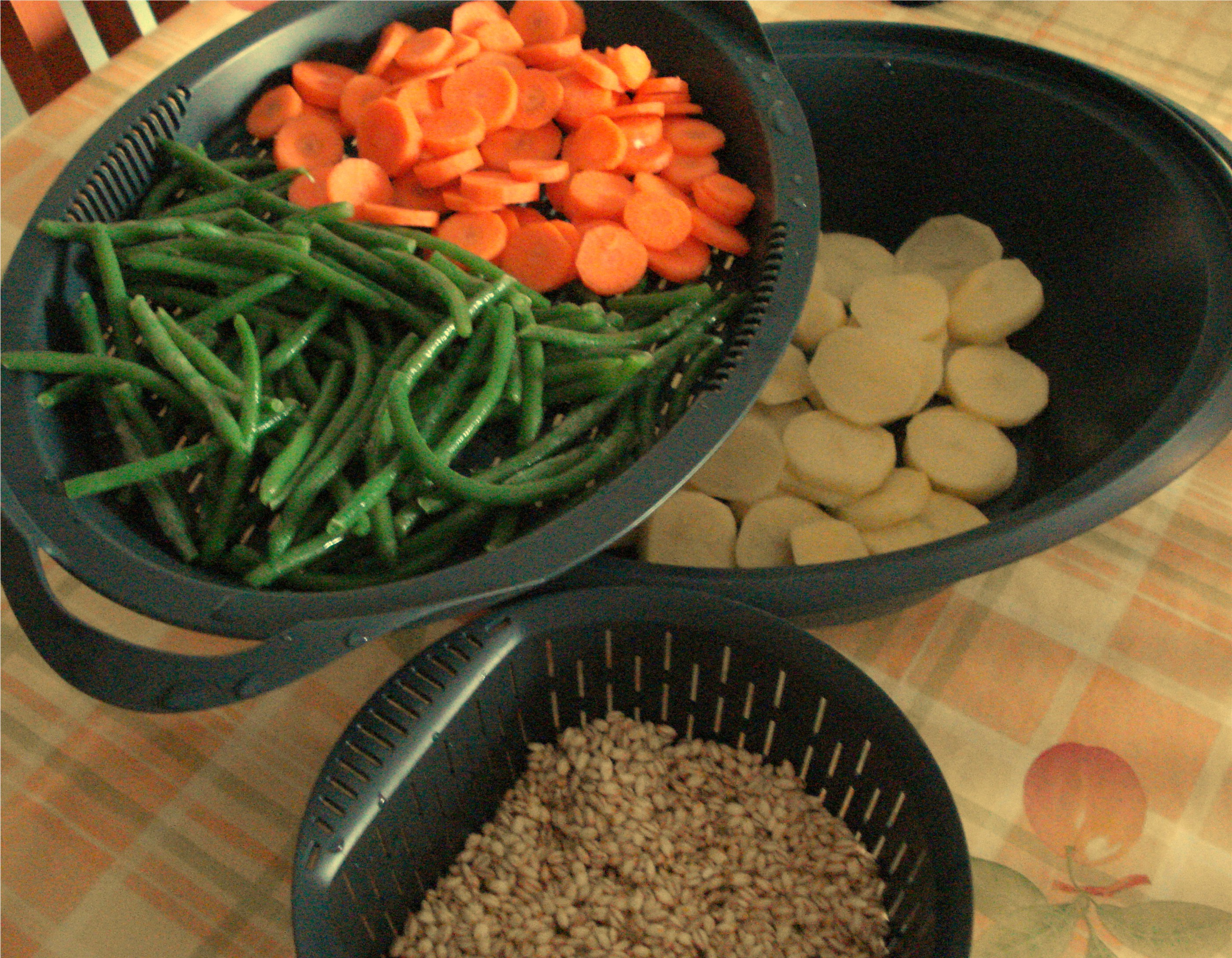 Senza lavare il coperchio chiuso"coperchio chiuso" , versare l’acqua e il sale, posizionare il cestello con l’orzo. Posizionare sul boccale il varoma con le patate, posizionare il  vassoio con le carote e i fagiolini, cuocere