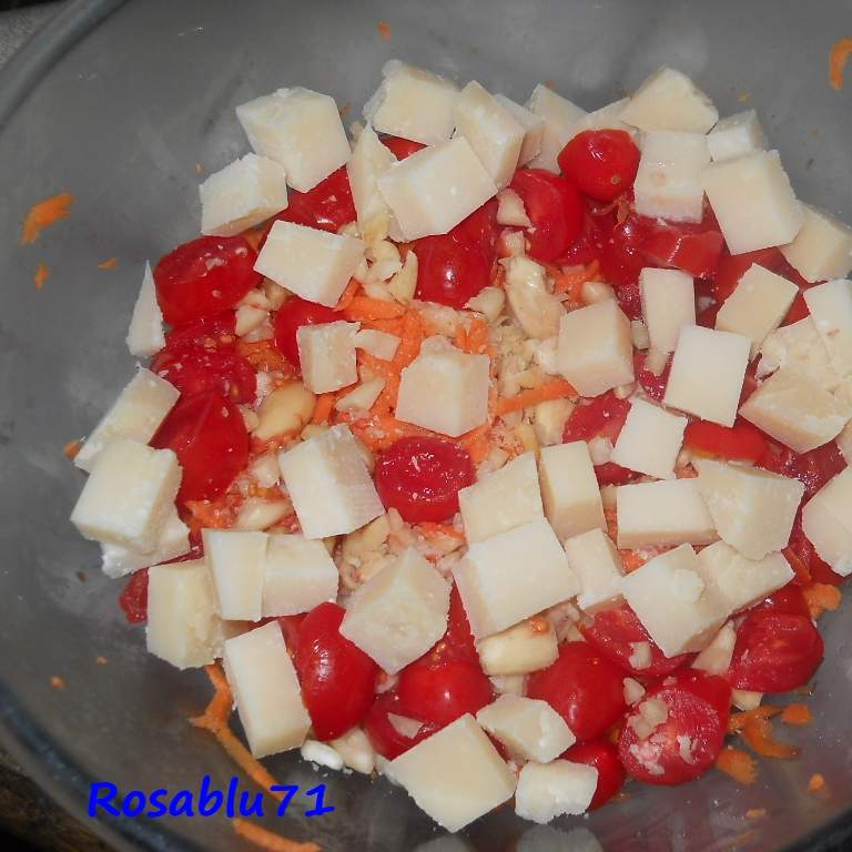 Nel frattempo lavate i pomodorini e dividerli in 2 poi raschiate le carote lavate asciugatele e garattugiatele con l'apposita grattugia e unite le verdure in una ciotola assieme alle mandorle tritate e grana a cubetti condite con olio oliva q.b.sale e pepe e fate macerare il tutto per 30 minuti nel frigorifero