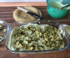 scaldare sul fuoco una padella antiaderente e spenellarla di olio, versare un mestolo di pastella e lasciare cuocere le crêpes una a una qualche minuto finché non si stacca, cuocere ogni crêpes dall'altro lato 30 secondi e mammano che ogni crêpes è cotta appoggiarla in un piatto, una sopra l’altra. (A me ne sono venute 14, dipende dal diametro della padella) - in una terrina rettangolare o rotonda mettere il primo strato di besciamella, poi sopra le crêpes e poi le verdure cotte sminuzzate oliate e salate, procedere con altri strati e ultimare con crepes, besciamella e una spolverata di farina i mandorle.
