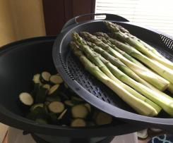 "coperchio chiuso" l’acqua, chiudere col coperchio, nel recipiente varoma mettere le zucchine a rondelle e sul vassoio varoma gli asparagi già puliti, chiudere col coperchio varoma e appoggiare il varoma completo di verdure sopra il coperchio del boccale. Cuocere 25 minuti a temperatura varoma velocità 2 per 25 minuti.