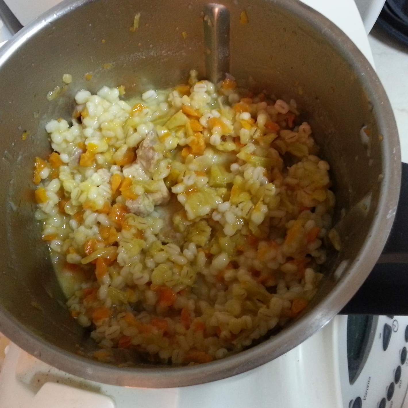 Aggiungere il dado, l'acqua, l'orzo e la pancetta tagliata a pezzettoni.