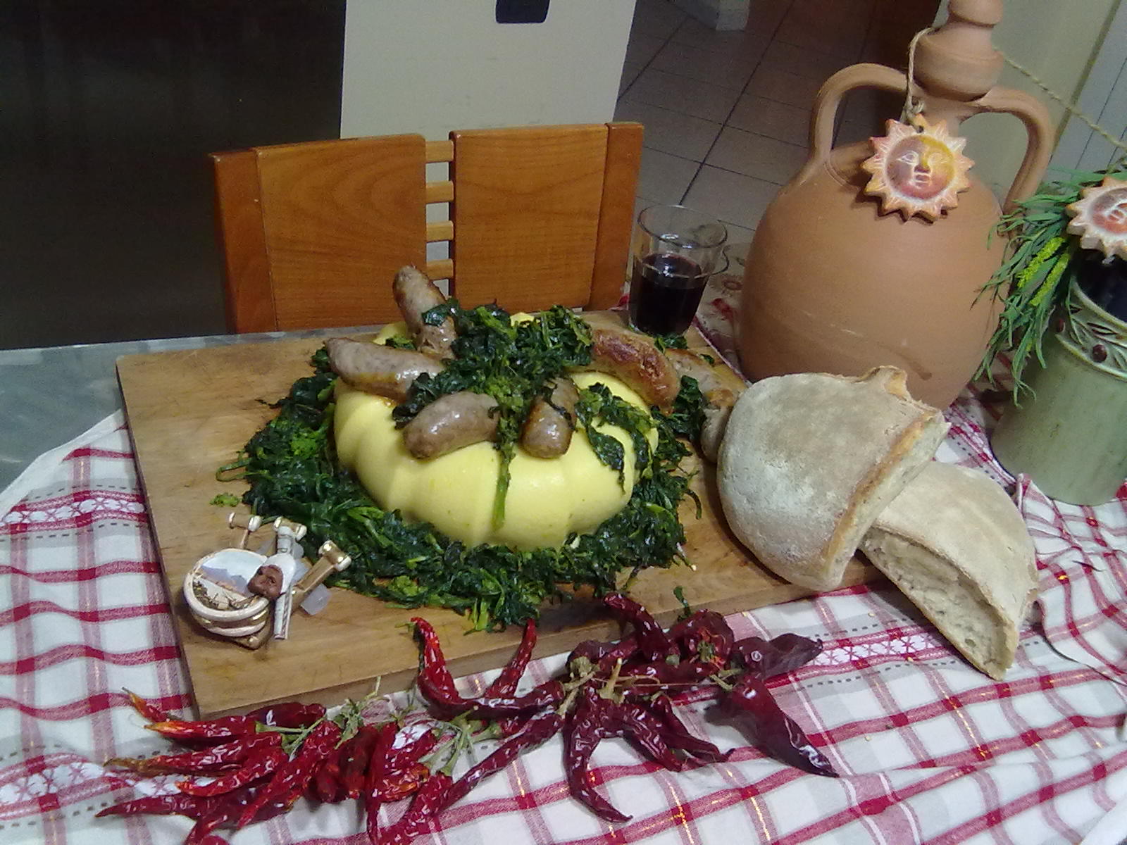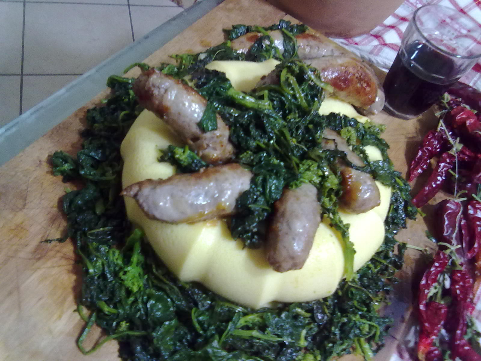 "antiorario" , sfumando col vino. Ultimata la cottura, tenere in caldo e sfornare la polenta., Sempre con lo stesso olio delle salsicce, cuocere le cime di rape, poco per volta, 15min.Varoma vel.1