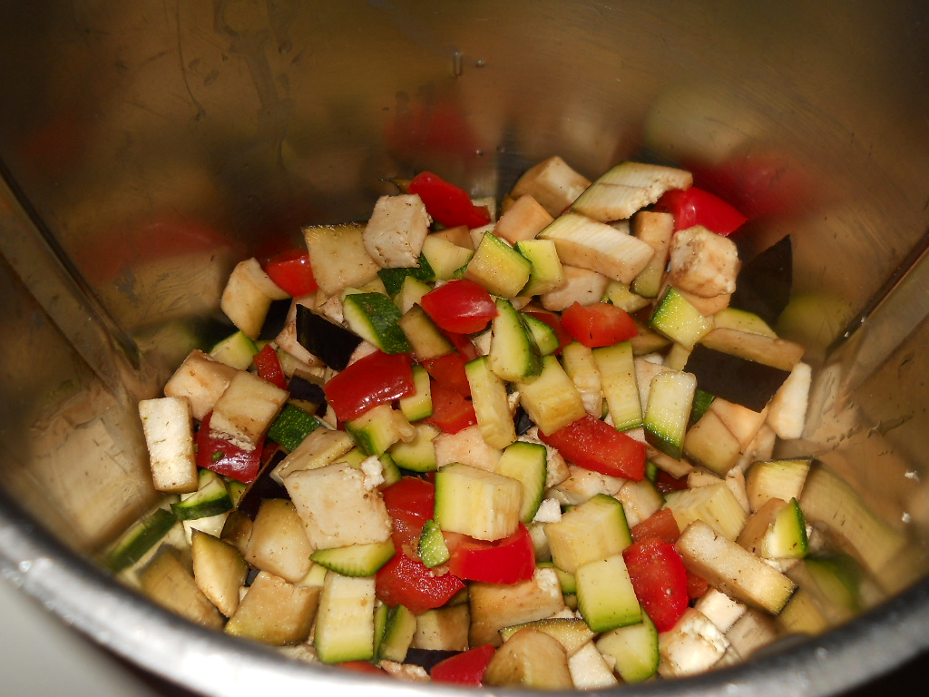 "coperchio chiuso" mettere olio e spicchio aglio in camicia fate rosolare per 3 Minuti 100° Vel 1. - Togliere l'aglio e poi aggiungere le nostre verdure aggiustare di sale e pepe e cuocerele per 10 Minuti 100°