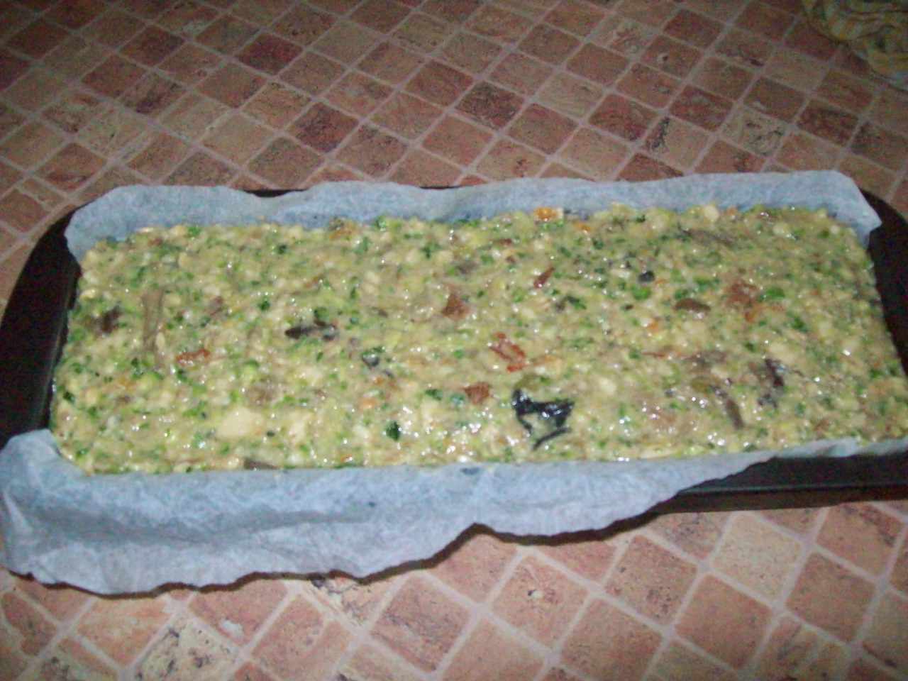 "antiorario" / vel 3. Mettere in una ciottola, aggiungere le zucchine, il peperone o i pomodori, tagliati a pezzetti, le olive, il formaggio ( lasciare 2-3 cucchiai da parte). Mescolare. Ora montare le chiare a neve ferma con un pizzico di sale. Aggiungere al composto di zucchine, mescolare delicatamente. La forma da plum cake rivestire di carta da forno. Sistemare il composto, cospargere con il formaggio rimasto. Cuocere nel forno caldo: 175° / 45min circa. Lasciare nel forno per 1h. Togliere dal forno, lasciare a raffreddare completamente, poi togliere dalla forma.
