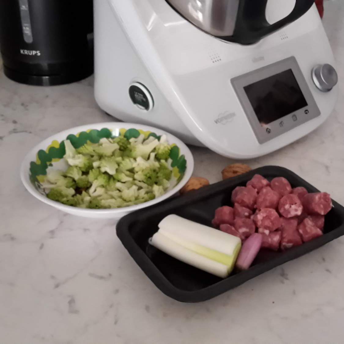 1. Gli ingredienti. Pulire il broccolo romano e ricavarne tante piccole cimette. Tagliare la salsiccia a pezzetti (preferibilmente una salsiccia con un budello resistente che non si sfaldi in cottura). Tritare le noci per 5 sec vel 5 e mettere da parte. Mettere lo scalogno e il porro nel