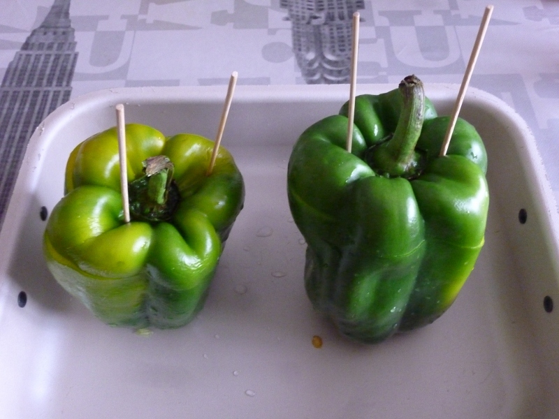 Lavate i peperoni interi, tagliategli "la testa" in modo da ottenere un coperchio (con tanto di picciolo) che utilizzerete per richiuderli; lavateli all'interno ed eliminate tutti i semi, dopodiché adagiateli in una teglia e riempiteli con il ripieno per 2/3 (se arrivate fino all'orlo rischia di fuoriuscire tutto durante la cottura!).