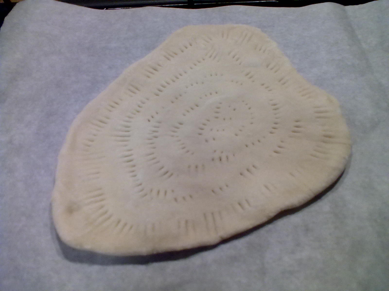 Dopo la lievitazione, dividere l'impasto in 4 palline, stenderle con il mattarello e bucherellarle con la forchetta. Infornare per 10 min. a 180° girandole a metà cottura.