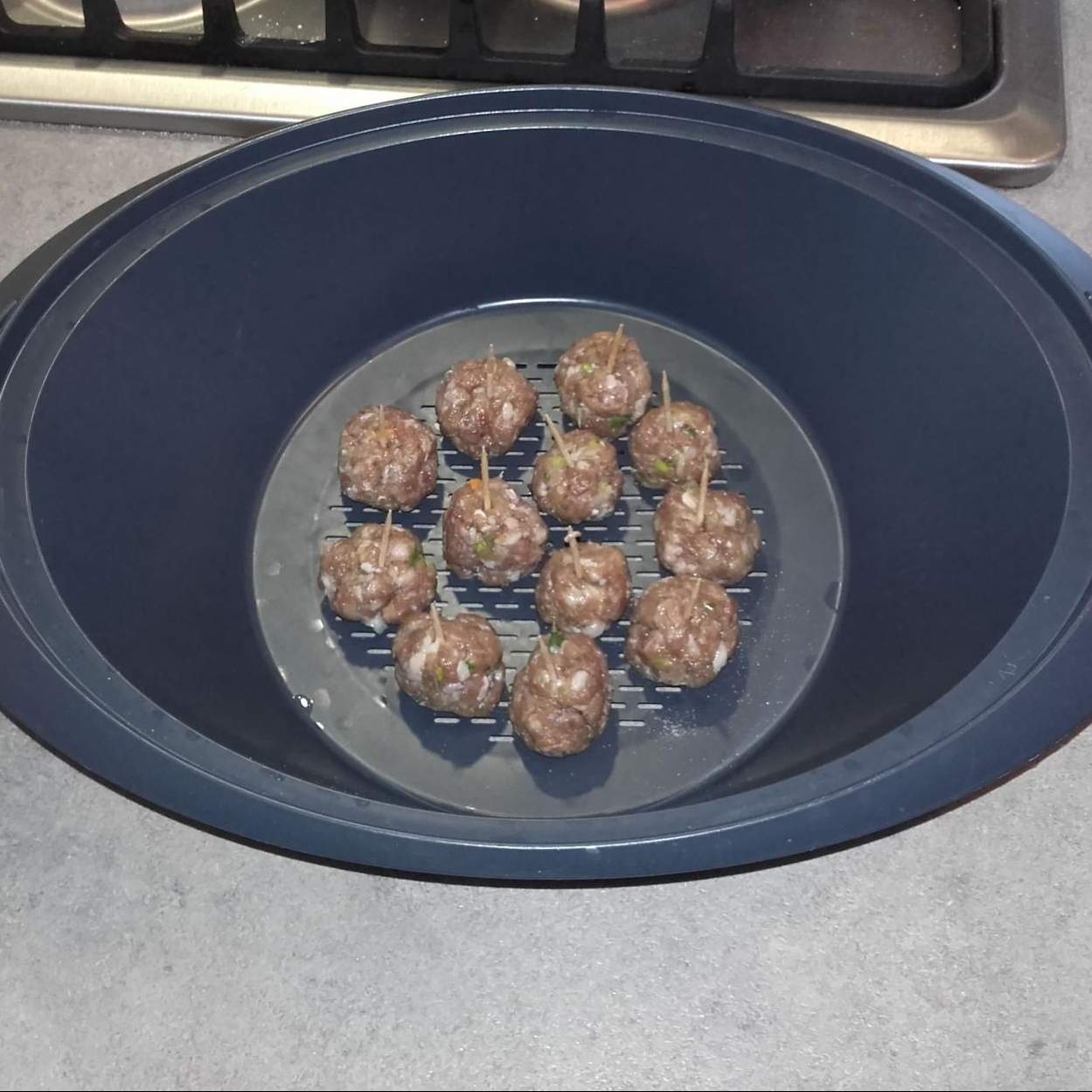 Proseguire riempiendo anche il fondo del varoma, qui ho messo solo la polpetta ma ho aggiunto il pomodorino dopo la cottura infilzato .
