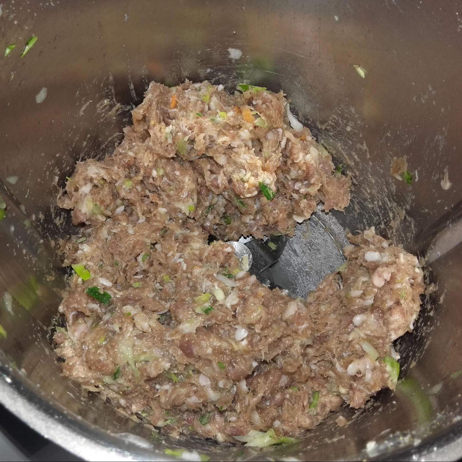 "coperchio chiuso" rosmarino , prezzemolo, aglio, i cipollotti e il battuto e tritare portando lentamente a vel. 7 per 10 sec.Aggiungere la carne, la salsa di soja e il pepe e amalgamare 30 sec. Vel. 5.