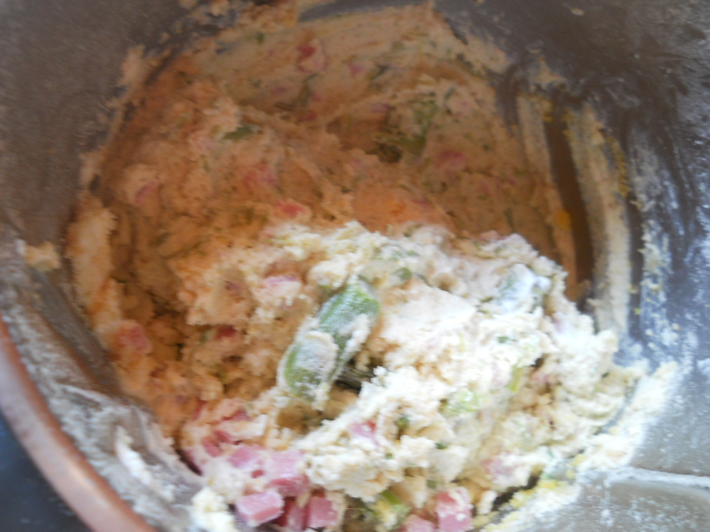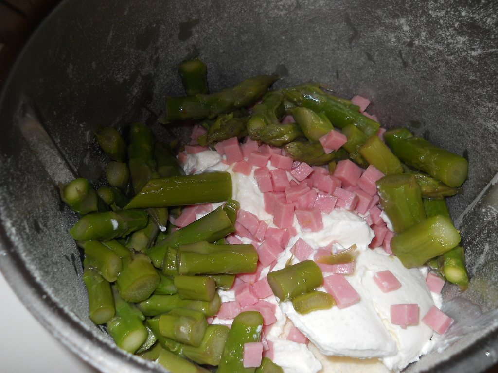 "coperchio chiuso" inserire pane secco e grana a pezzi e tritare 10 Sec Vel 9 ora aggiungere ricotta asparagi tagliati a pezzi prosciutto cotto sale pepe e l'uovo ed amalgamate il tutto per 20 Sec Vel 3 Trasferite l'impasto del nostro polpettone su un pezzo di carta forno e con l'aiuto di quest ultima date la forma al nostro polpettone una volta che e' pronto chiudete bene le 2 estremita' a forma di una caramella