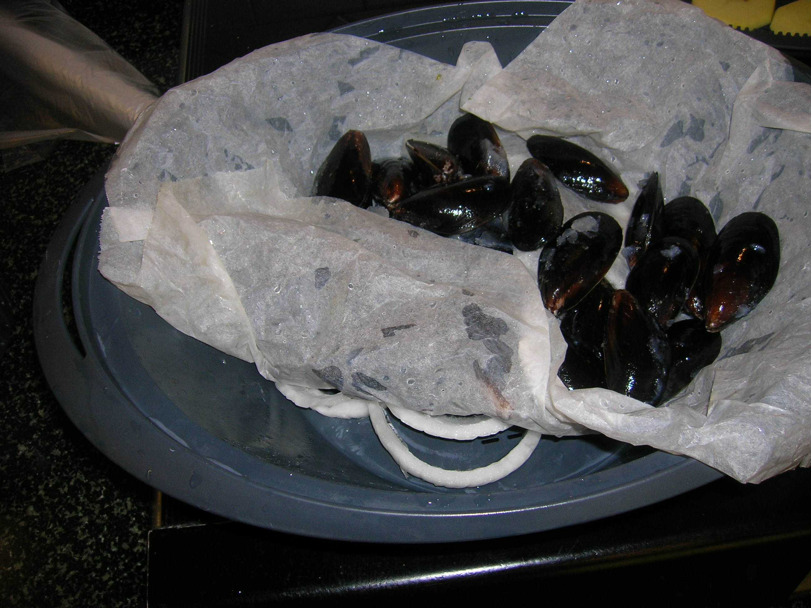 1. In precedenza ungere leggermente il varoma e disporre sul fondo le rondelle di cipolla quindi coprire con cartaforno bagnata e strizzata, mettere le cozze;