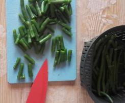 Tagliare a pezzetti regolari i fagiolini e la frittatina.