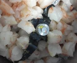2. Inserire nel coperchio chiuso"coperchio chiuso" olio (30 g), aglio in camicia, gamberoni a dadini e zeste di limone, insaporire 120°C 4 Min. Vel. 1antiorario"antiorario" .