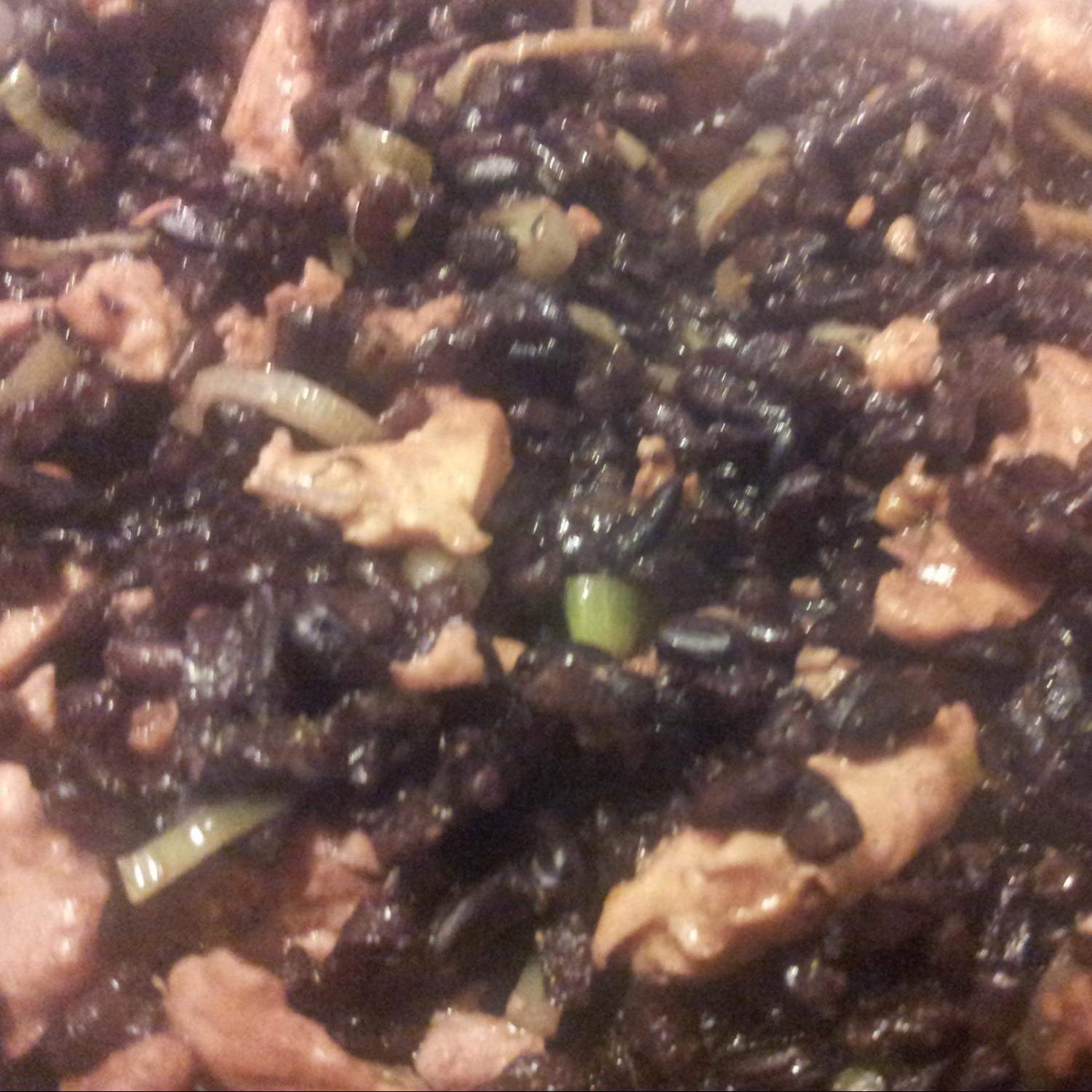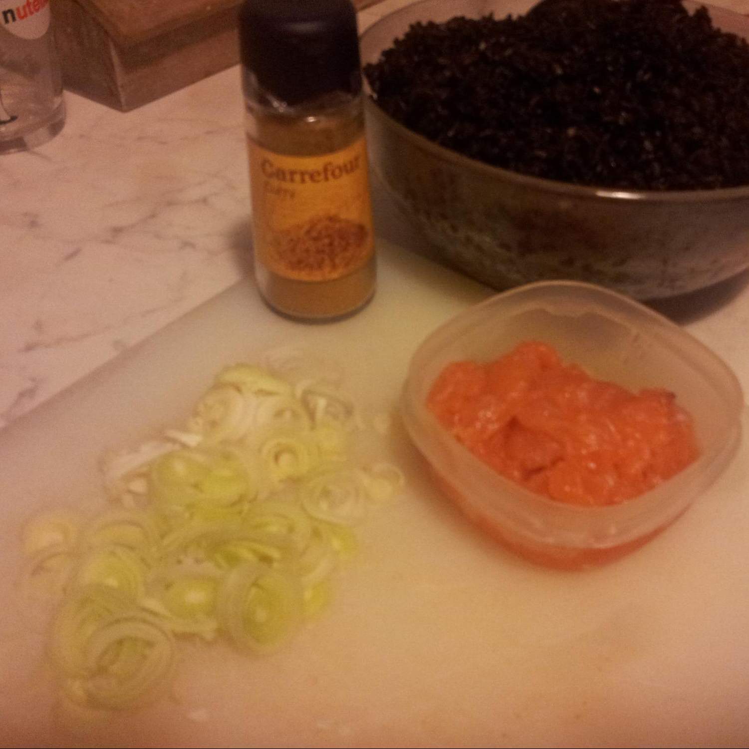 2. 2. Versare nel coperchio chiuso"coperchio chiuso" l'olio, i porri e cuocere per 2 min 80°. Aggiungere il salmone e il curry e cuocere ancora per 3 min a 100°. Versare il riso venere nel coperchio chiuso"coperchio chiuso" e mescolare per 1 min velantiorario"antiorario" . Versare su un piatto da portata.