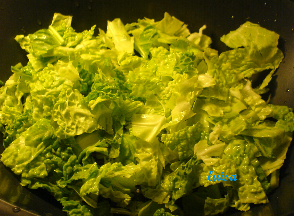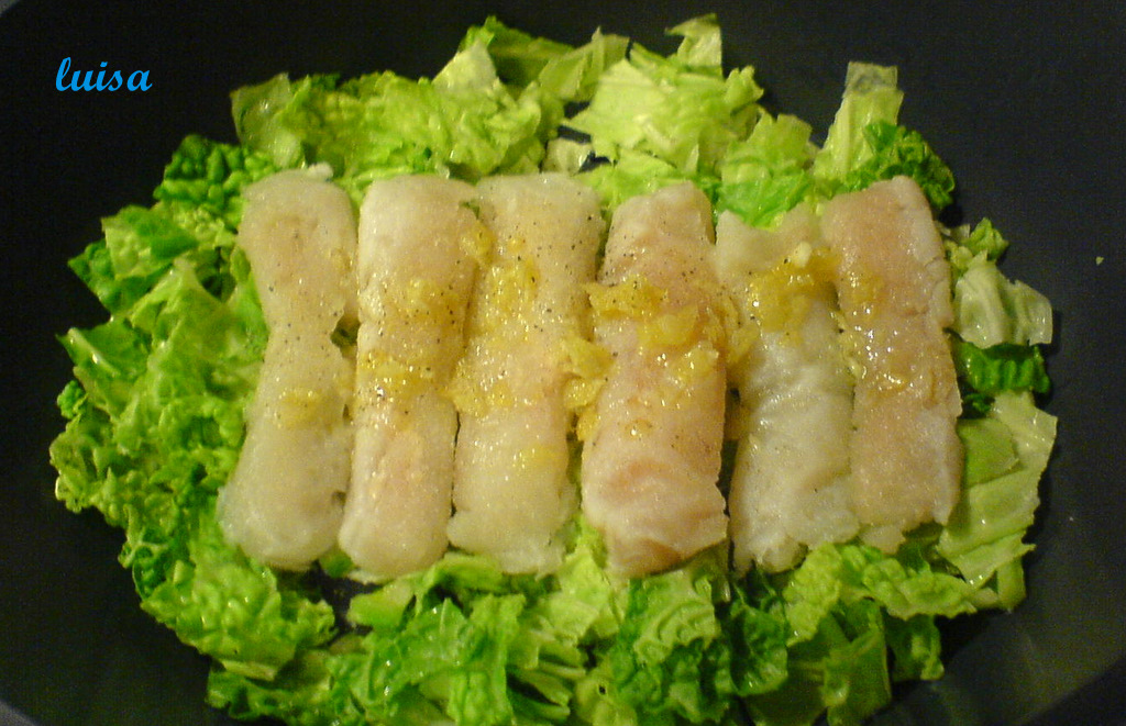 preparare i piatti: mettere la verza con i filetti di pesce e il riso condito con il resto delgli scalogni e olio