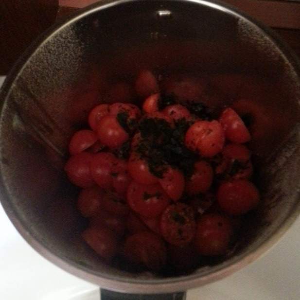 se dopo 20 min di cottura nel forno risultasse ancora un pò liquida,aumentare la cottura di altri 10 min.questo potrebbe dipendere da quanta acqua contengono i pomodorini.