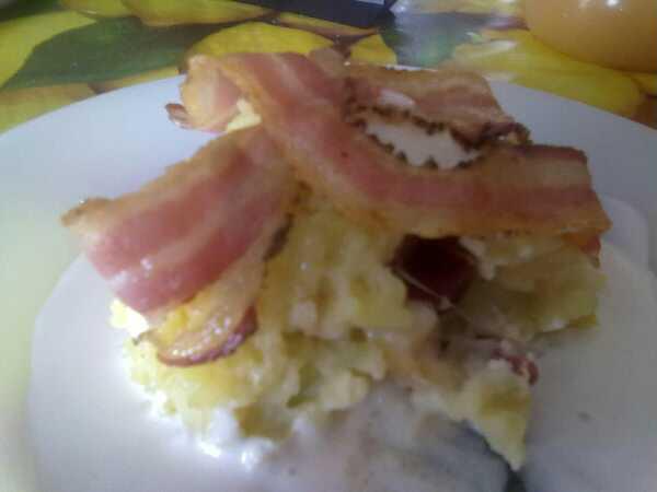 Innanzitutto prepariamo un delizioso gateau come da l.b., ma lo mettiamo al forno a 200à per 15min., ripartito in  6 coppette da forno, leggermente oleate. Nel frattempo prepariamo la ns. panna ca cucina:. 1 misurino di latte portato a vel.7/8 per 1 min., mentre, contemporaneamente , versiamo a filo un bicchiere di olio di arachidi. La panna ottenuta la dividiamo in 6 piatti (stendendola con un cucchiaino) e sopra ci versiamo i nostri sformatini capovolti. Approfittiamo del forno e ci tostiamo, sulla griglietta, le fettine di bacon che poi incroceremo sui nostri sformatini.