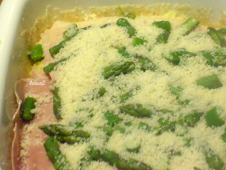 Imburrare e cospargere con il pangrattato una pirofila, versare metà composto di patate, il prosciutto cotto, gli asparagi, una bella spolverata di parmigiano e per ultimo il restante composto di patate. Cospargere con pangrattato e parmigiano, qualche fiocchetto di burro ed infornare per 20-25 min nel forno già caldo a 180°.