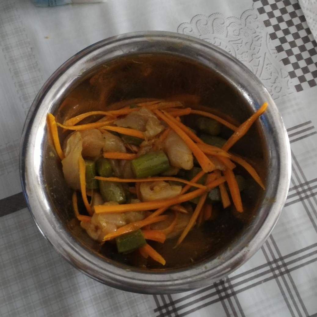 2. Mettere in una ciotola il pollo a tocchetti, la carota a julienne, le punte degli asparagi, il sale, l'olio e il curry. Mescolare con un cucchiaio.