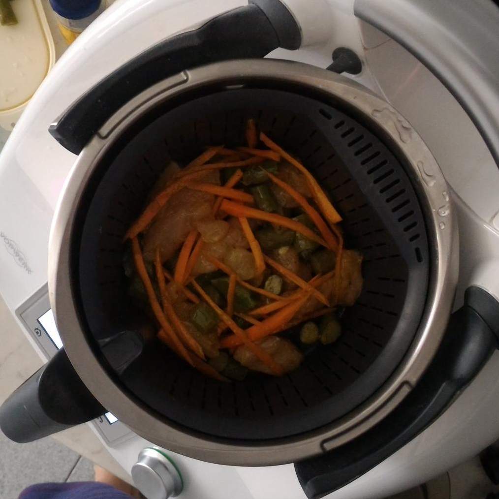 "coperchio chiuso" . Mettere il coperchio e cuocere per 15 min temp varoma vel 1. Con l'aiuto della spatola togliere il cestello e versare il contenuto in una zuppiera.