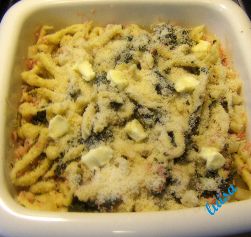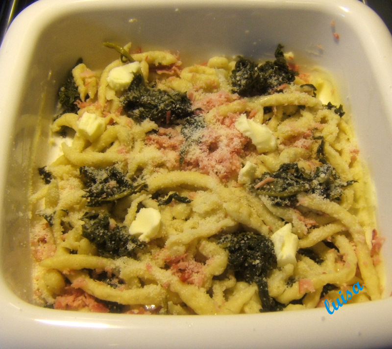Quando l'acqua bolle, inserire la pastella (in due o tre volte) nella gratuggia per spaetzli, appena vengono a galla, toglierli con un mestolo forato e metterli nella pirofila, cospargerli con altre erbette, prosciutto tritato e una spolverata di formaggio, così fino a quando sono finiti gli ingredienti, versare i 100 g di latte, cospargere con i formaggi e quanche fiocchetto di burro e infornare per 20 min (x gratinarli) ventilato