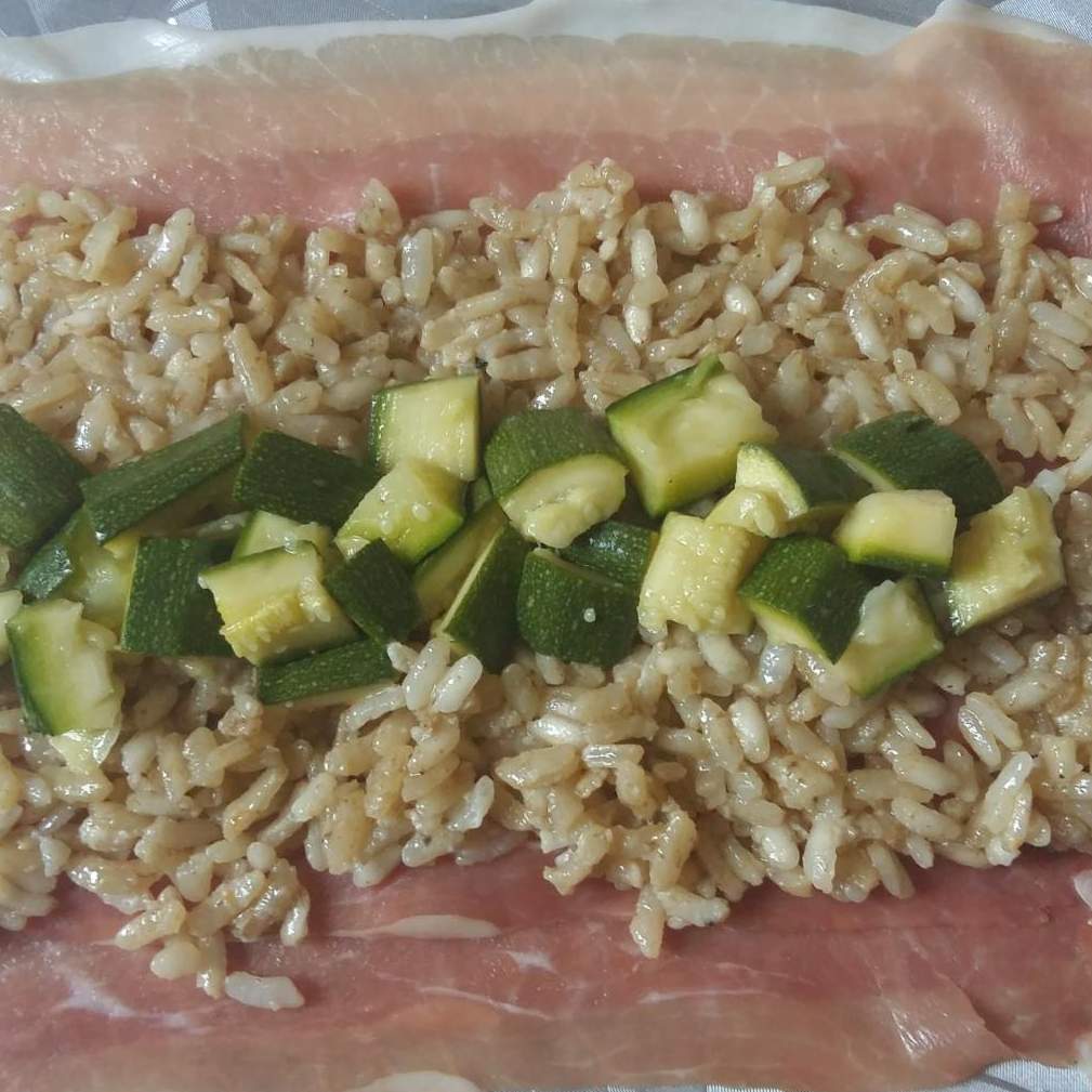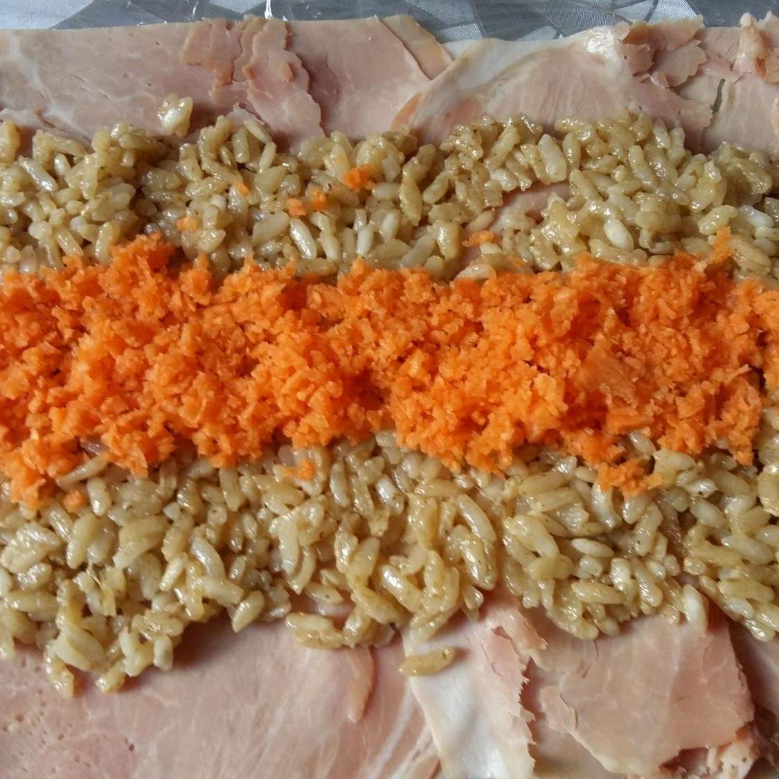 4- Trasferire il riso in una ciotola, unire la maionese e mescolare con un cucchiaio. Disporre quindi sul piano di lavoro due fogli di pellicola trasparente della lunghezza di circa 30 cm l'uno. Adagiare sul primo le fette di prosciutto cotto sovrapponendole l'una all'altra per circa 1 cm dal lato lungo. Sistemare uno strato sottile di riso lasciando 2 cm di spazio in entrambi i lati lunghi ( lati dai quali si partirà per formare i rotoli), compattare il riso con i rebbi di una forchetta, e al centro disporre per tutta la lunghezza le carote tritate in precedenza. Sul secondo foglio ripetere la stessa operazione con lo speck e sistemando al centro le zucchine.