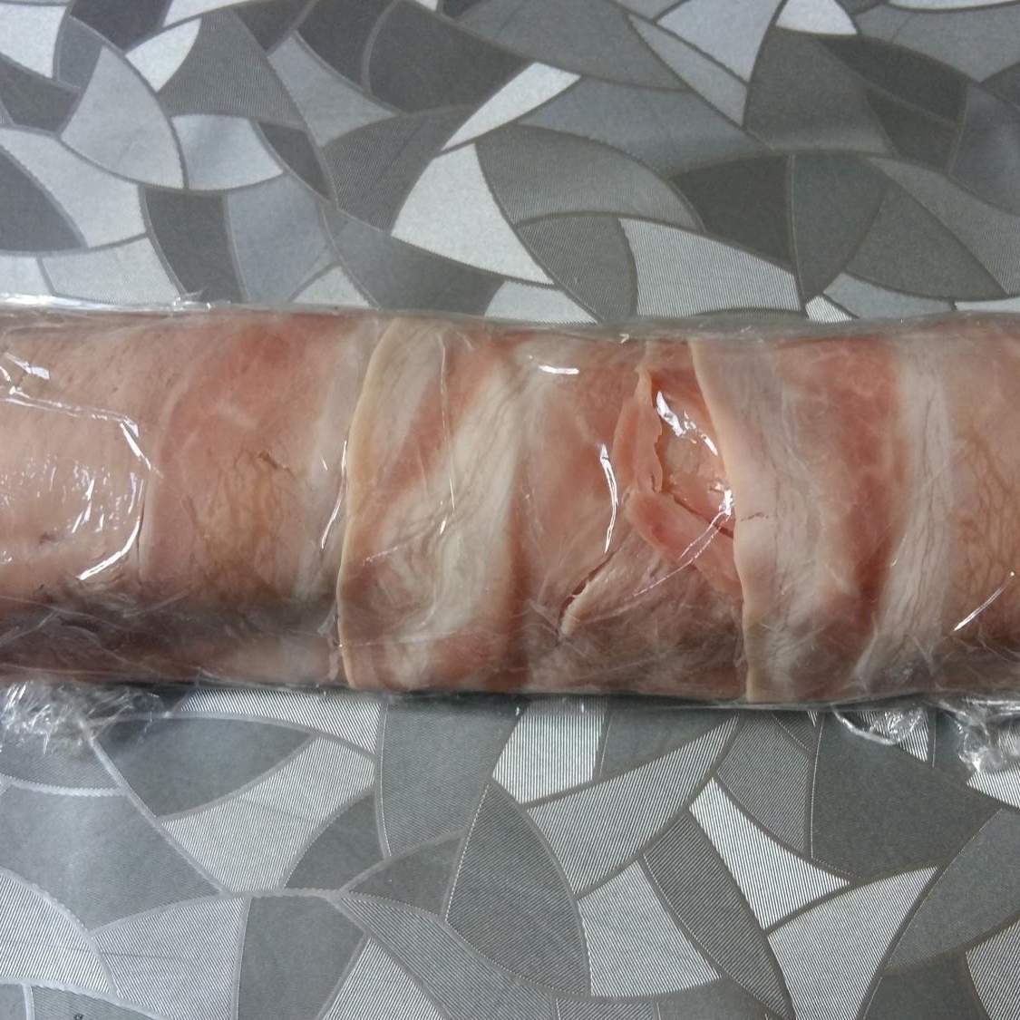 5- A questo punto, con l'aiuto della pellicola e con molta cautela, formare un rotolo con il prosciutto facendo in modo che il ripieno rimanga al centro e che i bordi delle fette vadano a sovrapporsi. Chiudere con la carta velina il rotolo formando una caramella. Ripetere la stessa procedura con il rotolo di speck.